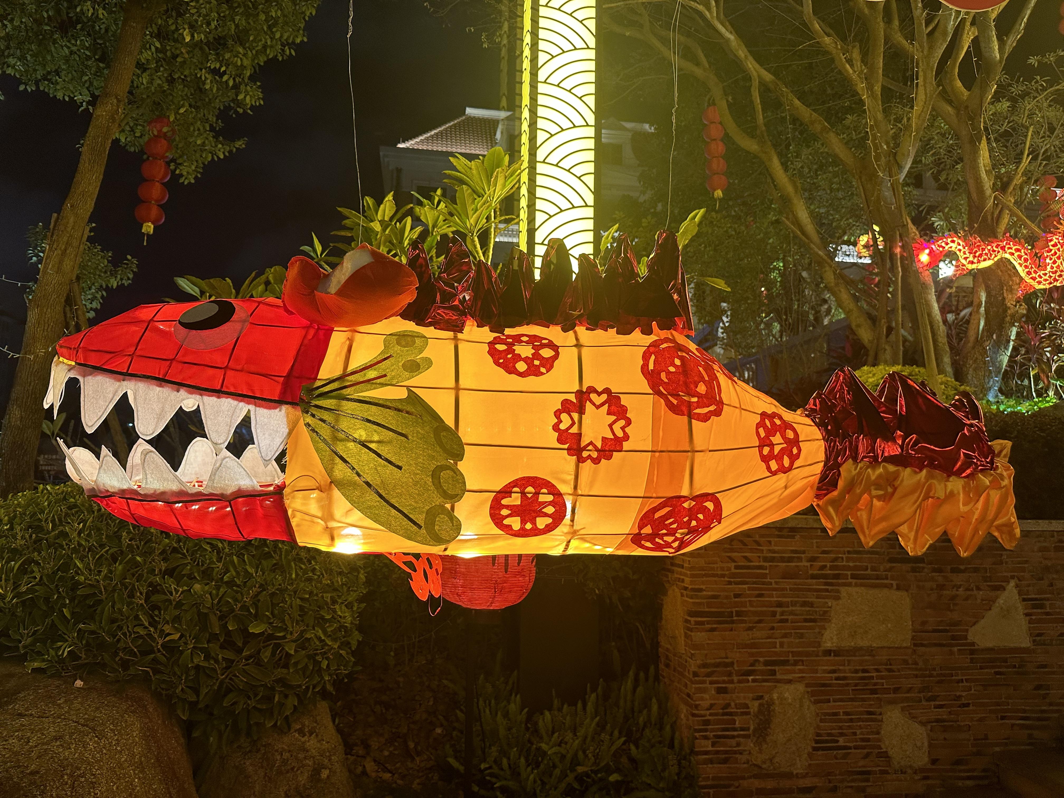 元宵期间,南少林文武坊展出了丰泽辖区内幼儿园、小学制作的世遗泉州龙年主题花灯及其他特色花灯600盏。从头戴簪花的龙形花灯,到左手持渔网右手拿箩筐的惠安女座灯,再到象征年年有余好运来临的锦鲤灯,无一不展示了学生们天马行空的想象力。学生们在传统的元宵花灯中加入当下流行的簪花、福船、“十龙九子”艺术装置等泉州元素。除了传统花灯中使用的各色布料、彩纸、流苏等材料,现场不少花灯利用生活中常见的泡沫、钢丝球、箩筐等物品,加以巧思,绘上彩画,摇身一变成为一盏盏独具特色的精美花灯。