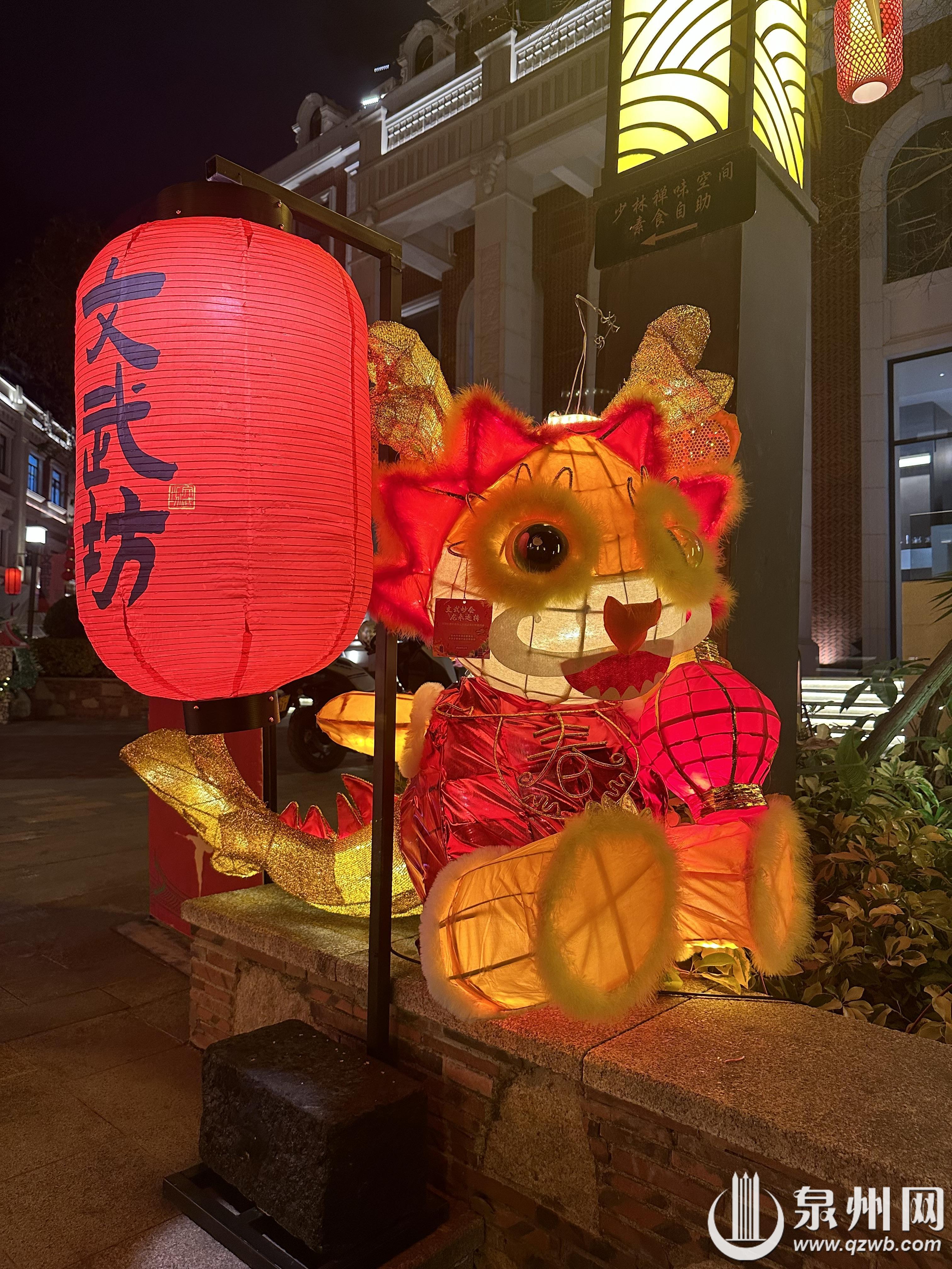元宵期间,南少林文武坊展出了丰泽辖区内幼儿园、小学制作的世遗泉州龙年主题花灯及其他特色花灯600盏。从头戴簪花的龙形花灯,到左手持渔网右手拿箩筐的惠安女座灯,再到象征年年有余好运来临的锦鲤灯,无一不展示了学生们天马行空的想象力。学生们在传统的元宵花灯中加入当下流行的簪花、福船、“十龙九子”艺术装置等泉州元素。除了传统花灯中使用的各色布料、彩纸、流苏等材料,现场不少花灯利用生活中常见的泡沫、钢丝球、箩筐等物品,加以巧思,绘上彩画,摇身一变成为一盏盏独具特色的精美花灯。