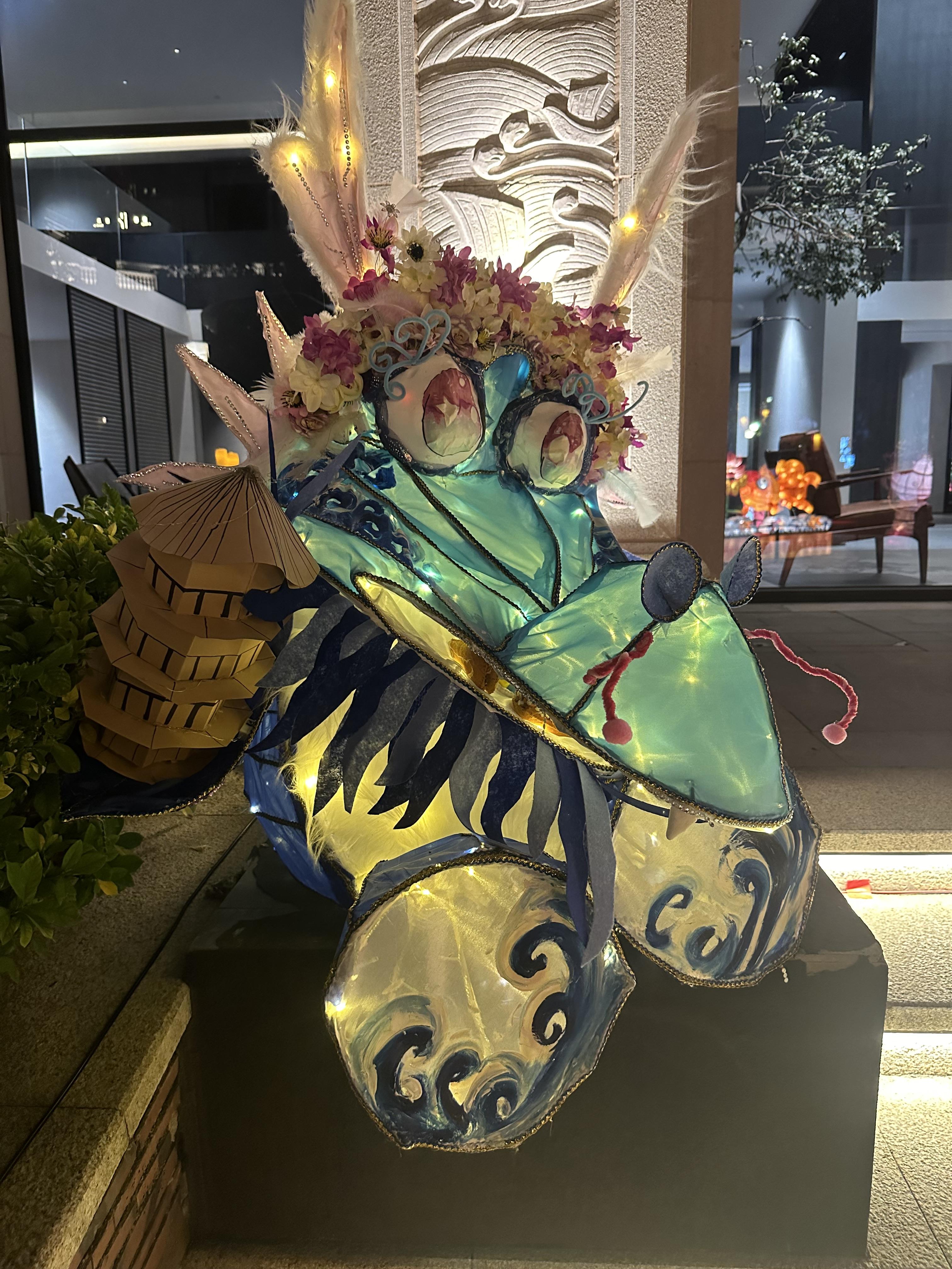 元宵期间,南少林文武坊展出了丰泽辖区内幼儿园、小学制作的世遗泉州龙年主题花灯及其他特色花灯600盏。从头戴簪花的龙形花灯,到左手持渔网右手拿箩筐的惠安女座灯,再到象征年年有余好运来临的锦鲤灯,无一不展示了学生们天马行空的想象力。学生们在传统的元宵花灯中加入当下流行的簪花、福船、“十龙九子”艺术装置等泉州元素。除了传统花灯中使用的各色布料、彩纸、流苏等材料,现场不少花灯利用生活中常见的泡沫、钢丝球、箩筐等物品,加以巧思,绘上彩画,摇身一变成为一盏盏独具特色的精美花灯。
