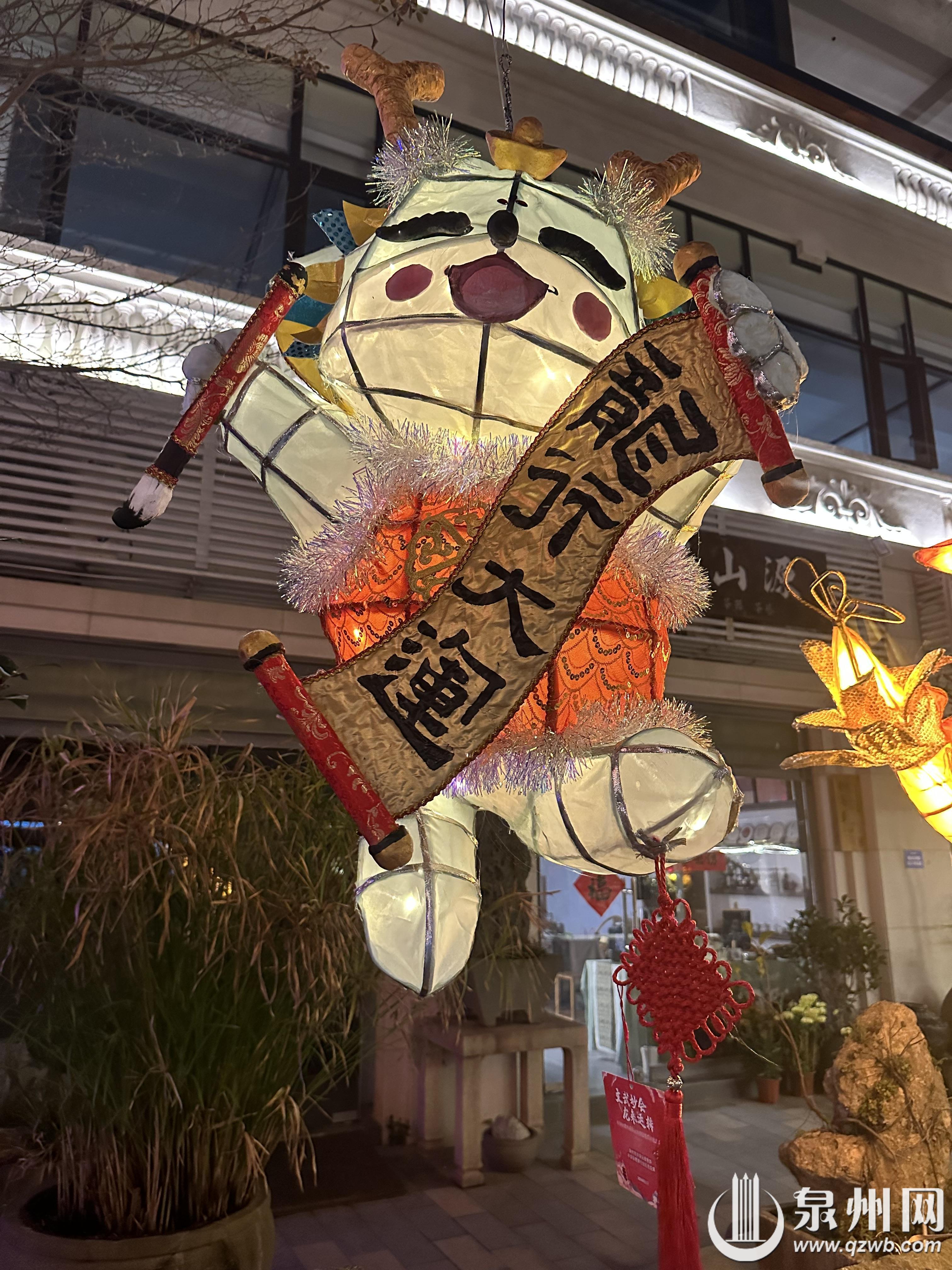 元宵期间,南少林文武坊展出了丰泽辖区内幼儿园、小学制作的世遗泉州龙年主题花灯及其他特色花灯600盏。从头戴簪花的龙形花灯,到左手持渔网右手拿箩筐的惠安女座灯,再到象征年年有余好运来临的锦鲤灯,无一不展示了学生们天马行空的想象力。学生们在传统的元宵花灯中加入当下流行的簪花、福船、“十龙九子”艺术装置等泉州元素。除了传统花灯中使用的各色布料、彩纸、流苏等材料,现场不少花灯利用生活中常见的泡沫、钢丝球、箩筐等物品,加以巧思,绘上彩画,摇身一变成为一盏盏独具特色的精美花灯。