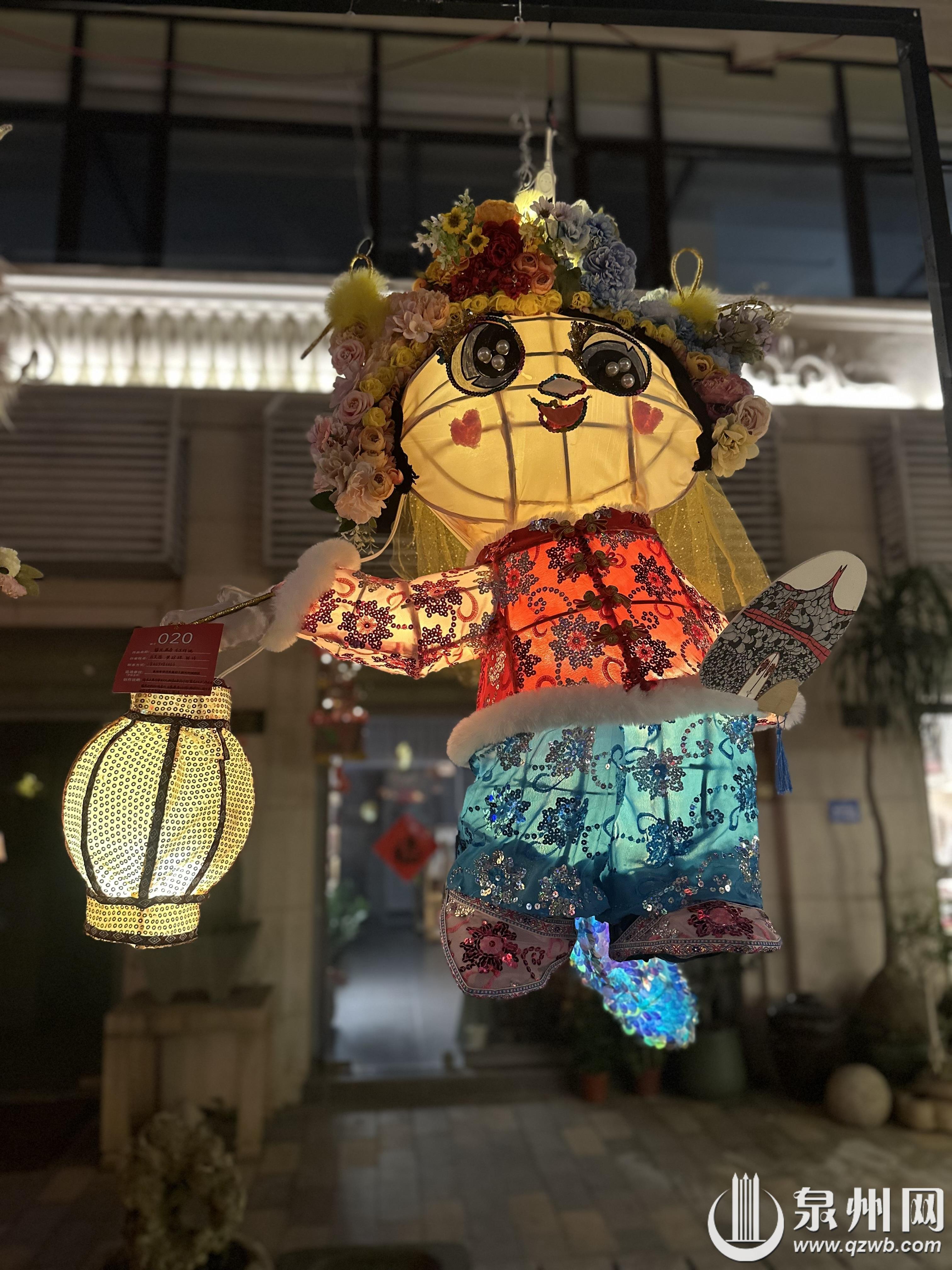 元宵期间,南少林文武坊展出了丰泽辖区内幼儿园、小学制作的世遗泉州龙年主题花灯及其他特色花灯600盏。从头戴簪花的龙形花灯,到左手持渔网右手拿箩筐的惠安女座灯,再到象征年年有余好运来临的锦鲤灯,无一不展示了学生们天马行空的想象力。学生们在传统的元宵花灯中加入当下流行的簪花、福船、“十龙九子”艺术装置等泉州元素。除了传统花灯中使用的各色布料、彩纸、流苏等材料,现场不少花灯利用生活中常见的泡沫、钢丝球、箩筐等物品,加以巧思,绘上彩画,摇身一变成为一盏盏独具特色的精美花灯。