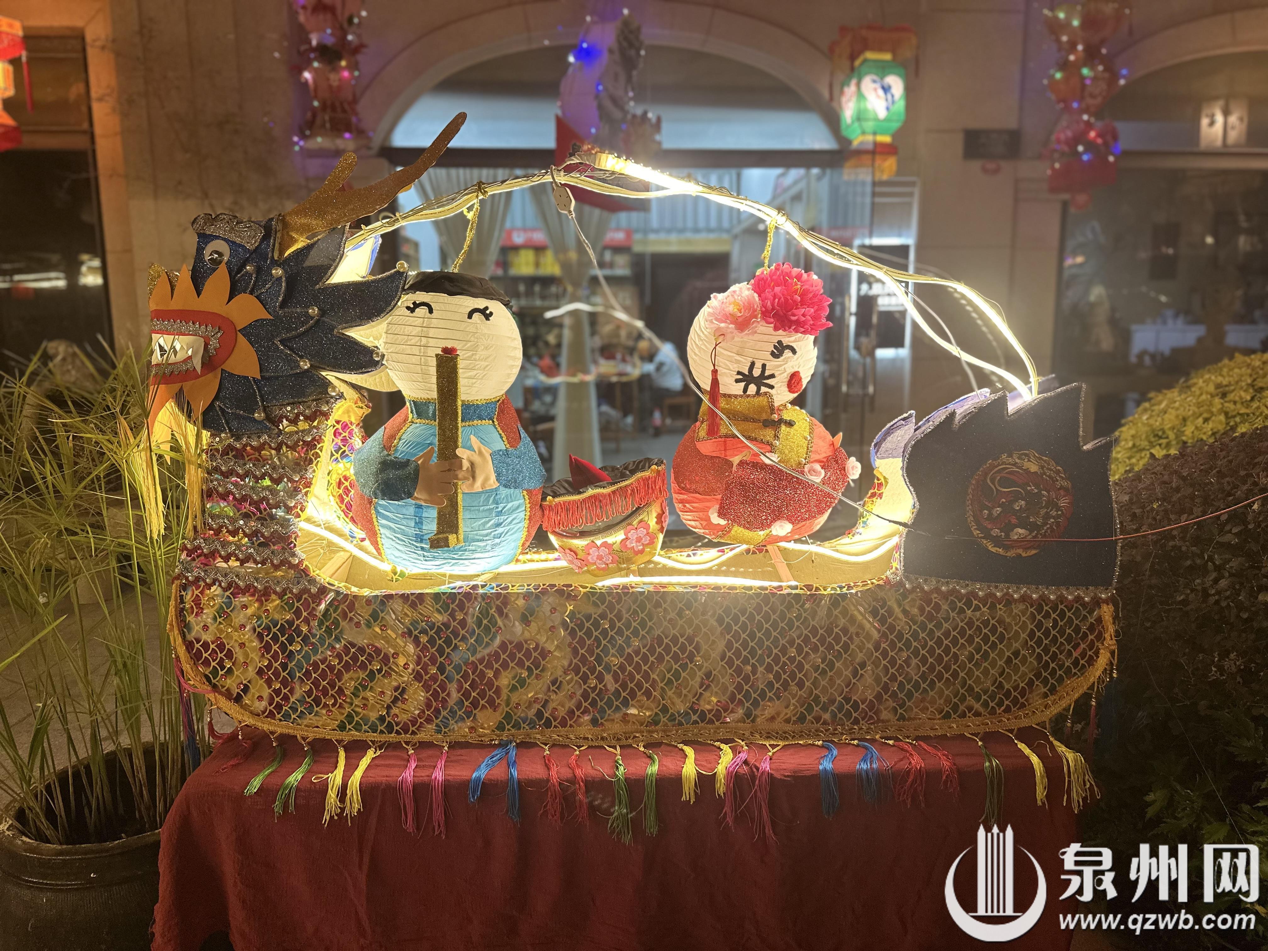 元宵期间,南少林文武坊展出了丰泽辖区内幼儿园、小学制作的世遗泉州龙年主题花灯及其他特色花灯600盏。从头戴簪花的龙形花灯,到左手持渔网右手拿箩筐的惠安女座灯,再到象征年年有余好运来临的锦鲤灯,无一不展示了学生们天马行空的想象力。学生们在传统的元宵花灯中加入当下流行的簪花、福船、“十龙九子”艺术装置等泉州元素。除了传统花灯中使用的各色布料、彩纸、流苏等材料,现场不少花灯利用生活中常见的泡沫、钢丝球、箩筐等物品,加以巧思,绘上彩画,摇身一变成为一盏盏独具特色的精美花灯。