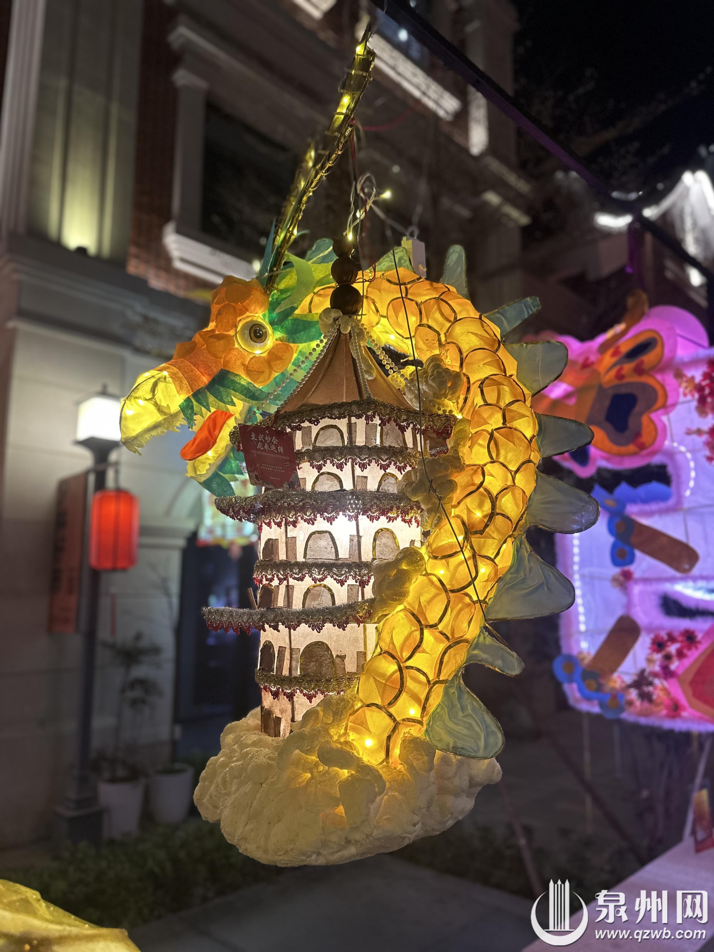 元宵期间,南少林文武坊展出了丰泽辖区内幼儿园、小学制作的世遗泉州龙年主题花灯及其他特色花灯600盏。从头戴簪花的龙形花灯,到左手持渔网右手拿箩筐的惠安女座灯,再到象征年年有余好运来临的锦鲤灯,无一不展示了学生们天马行空的想象力。学生们在传统的元宵花灯中加入当下流行的簪花、福船、“十龙九子”艺术装置等泉州元素。除了传统花灯中使用的各色布料、彩纸、流苏等材料,现场不少花灯利用生活中常见的泡沫、钢丝球、箩筐等物品,加以巧思,绘上彩画,摇身一变成为一盏盏独具特色的精美花灯。