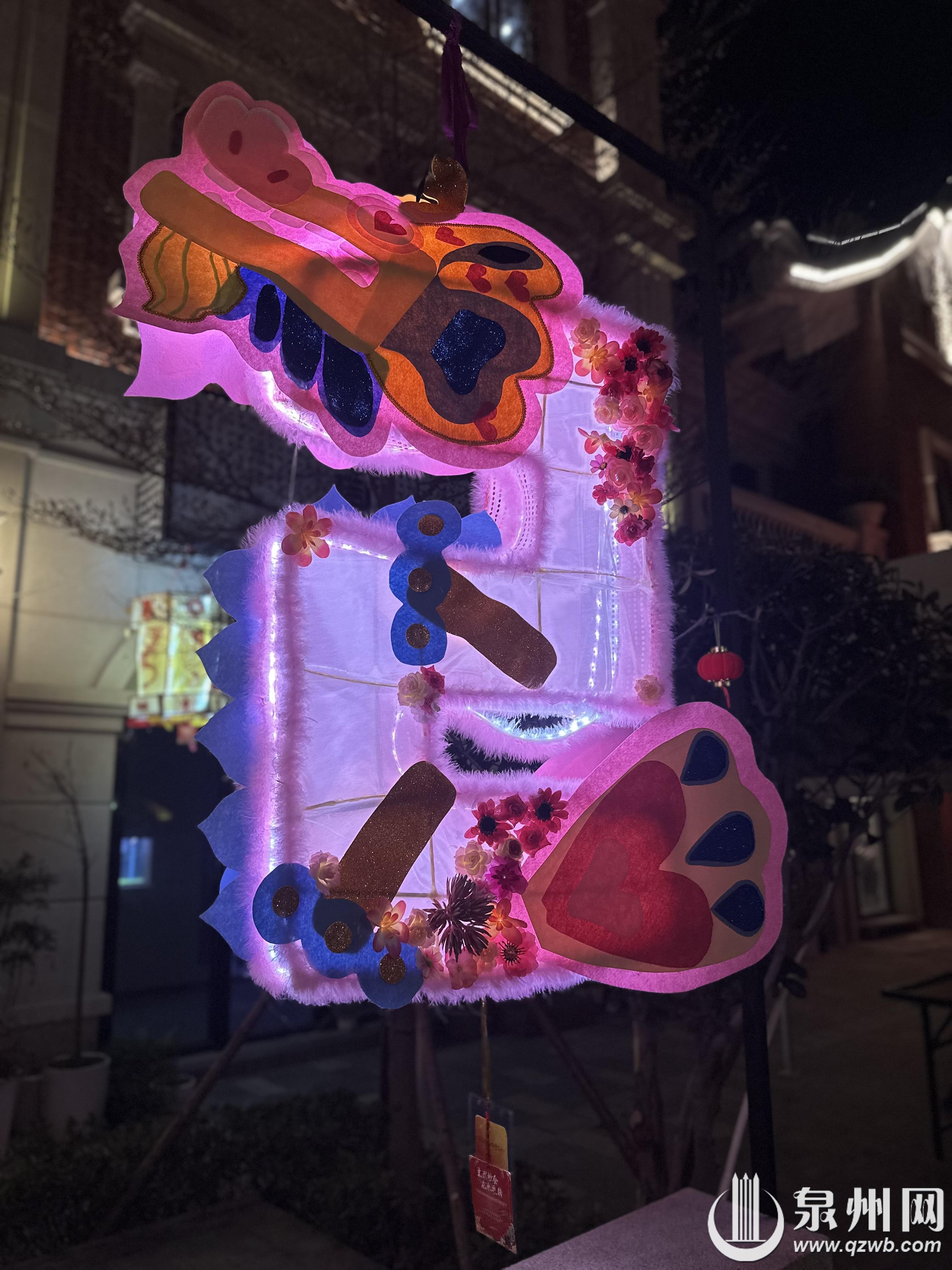 元宵期间,南少林文武坊展出了丰泽辖区内幼儿园、小学制作的世遗泉州龙年主题花灯及其他特色花灯600盏。从头戴簪花的龙形花灯,到左手持渔网右手拿箩筐的惠安女座灯,再到象征年年有余好运来临的锦鲤灯,无一不展示了学生们天马行空的想象力。学生们在传统的元宵花灯中加入当下流行的簪花、福船、“十龙九子”艺术装置等泉州元素。除了传统花灯中使用的各色布料、彩纸、流苏等材料,现场不少花灯利用生活中常见的泡沫、钢丝球、箩筐等物品,加以巧思,绘上彩画,摇身一变成为一盏盏独具特色的精美花灯。