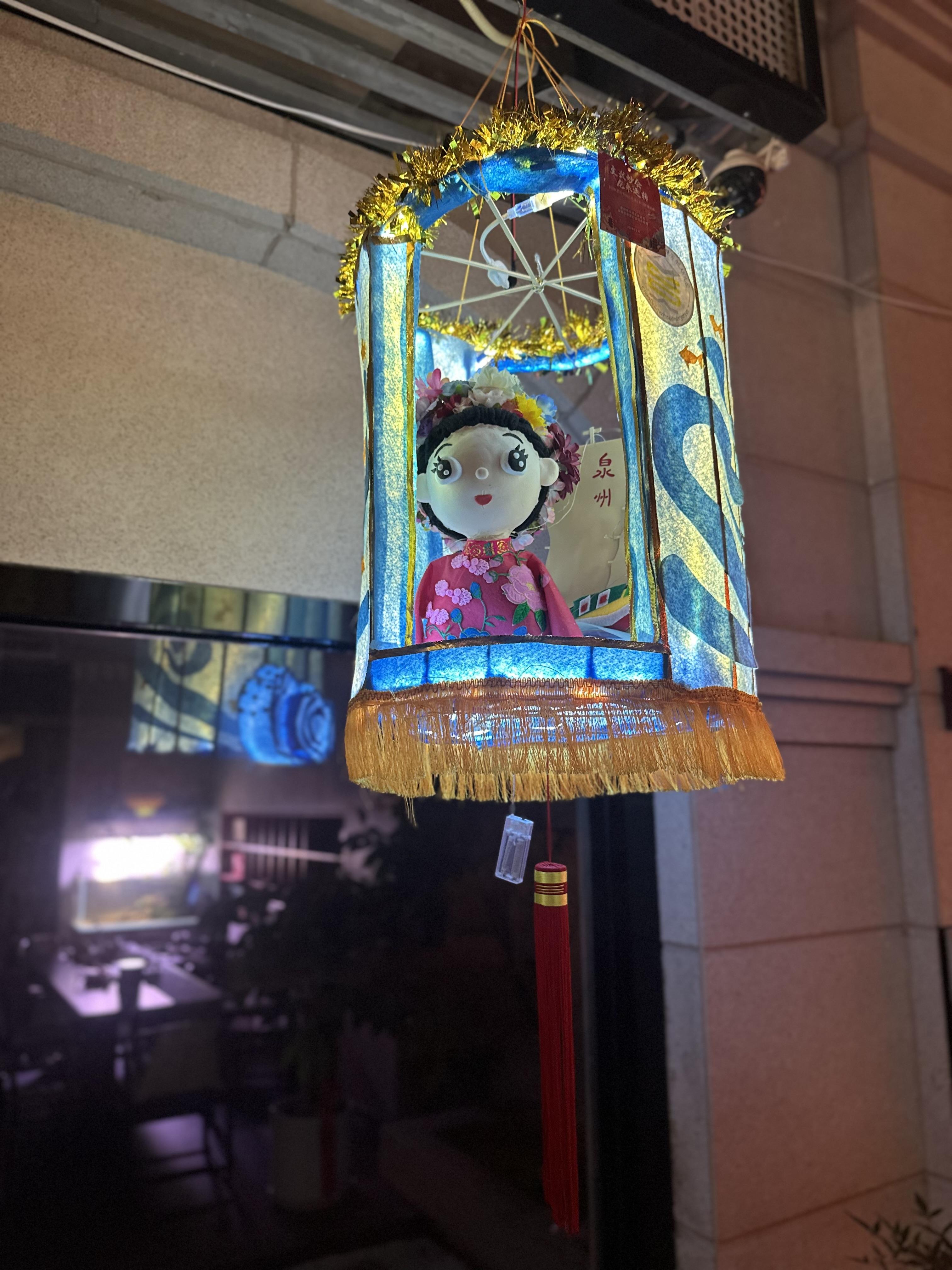元宵期间,南少林文武坊展出了丰泽辖区内幼儿园、小学制作的世遗泉州龙年主题花灯及其他特色花灯600盏。从头戴簪花的龙形花灯,到左手持渔网右手拿箩筐的惠安女座灯,再到象征年年有余好运来临的锦鲤灯,无一不展示了学生们天马行空的想象力。学生们在传统的元宵花灯中加入当下流行的簪花、福船、“十龙九子”艺术装置等泉州元素。除了传统花灯中使用的各色布料、彩纸、流苏等材料,现场不少花灯利用生活中常见的泡沫、钢丝球、箩筐等物品,加以巧思,绘上彩画,摇身一变成为一盏盏独具特色的精美花灯。