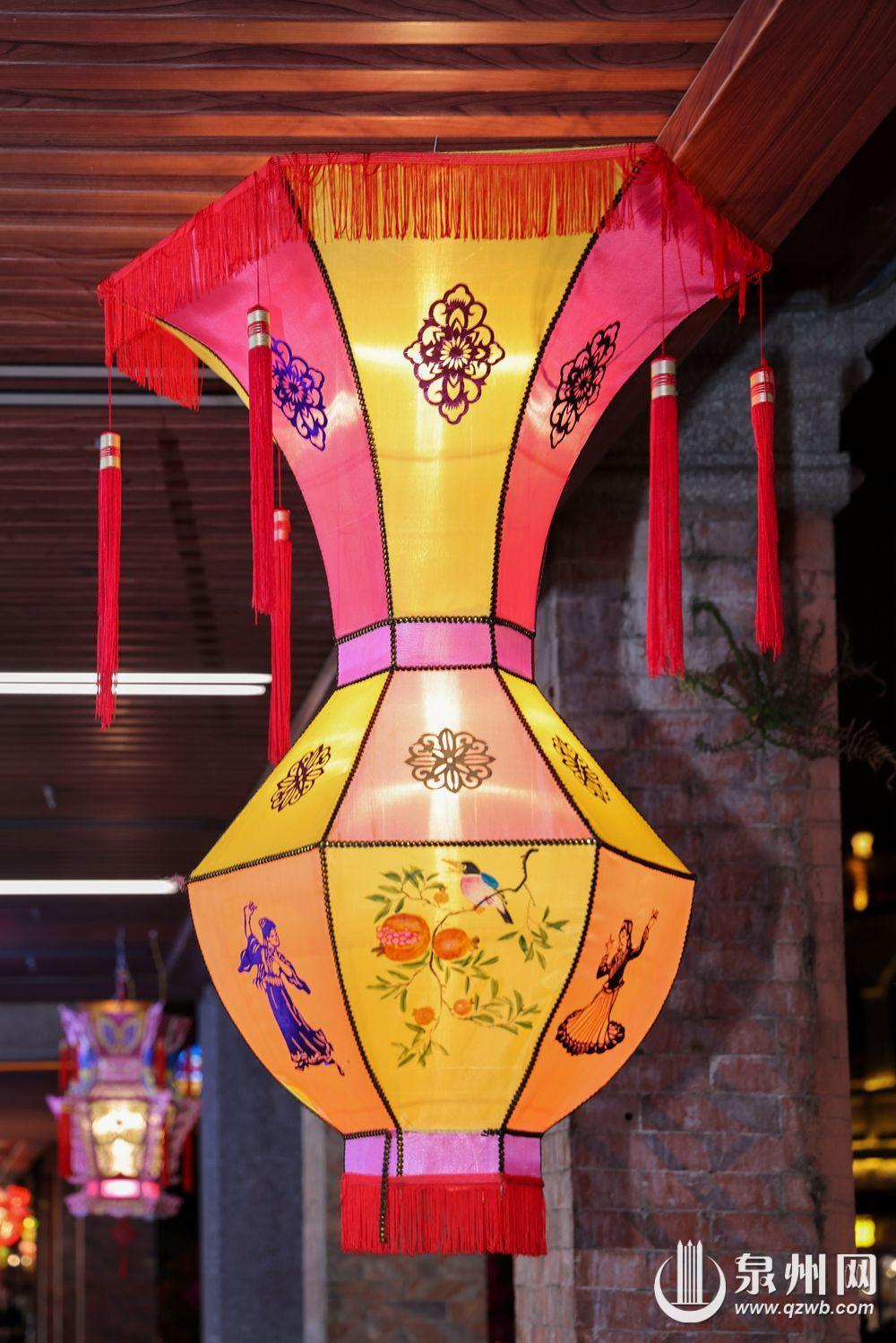彩扎灯是泉州传统的花灯形式。制作时,先用纸捻将竹篾绑扎成灯的骨架,再把裁好的纸或绸布喷水绷粘在骨架上,然后贴上花边、描上图案、挂上丝穗。彩扎灯造型多样,外形不受限制,因此既可做大,也可小巧玲珑,各种飞禽走兽、名山古刹、花草物什皆能模仿得惟妙惟肖。