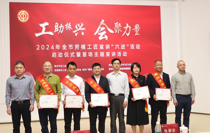市、县工会领导为2024年劳模工匠宣讲团成员代表和劳模工匠乡村振兴“特派员”代表颁发聘书;为第三批泉州职工思想教育基地代表授牌。