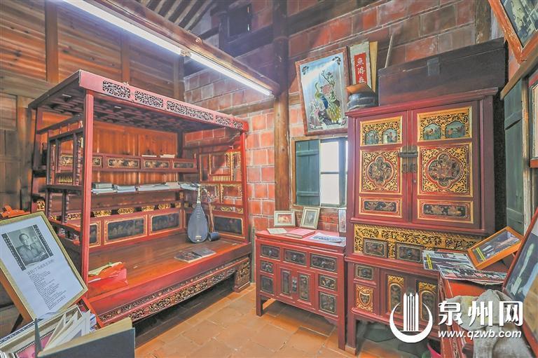 二楼左侧房即为丁马成夫妻居住之所。房间不大,规矩中透着精巧。房子中间有闽南古眠床一张,三面遮风堵上皆有描金装饰图案以及镂空木雕画,雕刻的题材多以历史人物故事为主。在置物的笼板上,还堆放着大量丁马成先生留下的曲谱作品及其南音研究等文章。左侧遮风堵还斜倚着丁马成早年用过的琵琶与二弦,令人睹物思人。房内挂满相框,里面满是家族成员照片,岁月流淌而过,但照片上的笑容依旧真挚。二楼右侧房则为客居房,门口还悬挂着新加坡湘灵音乐社的标识小旗,不知此屋是否曾有该社的南音乐师入住过。