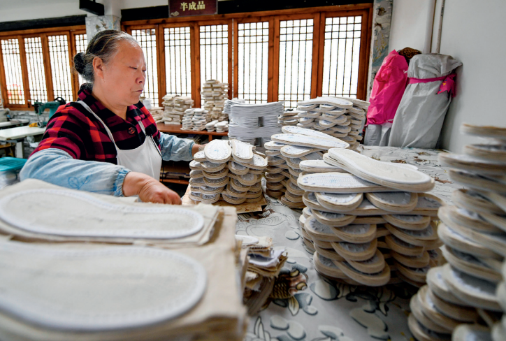 △ 2020年4月17日,成都市郫都区唐昌街道战旗村,赖淑芳整理摆放制作完成的布鞋鞋底。