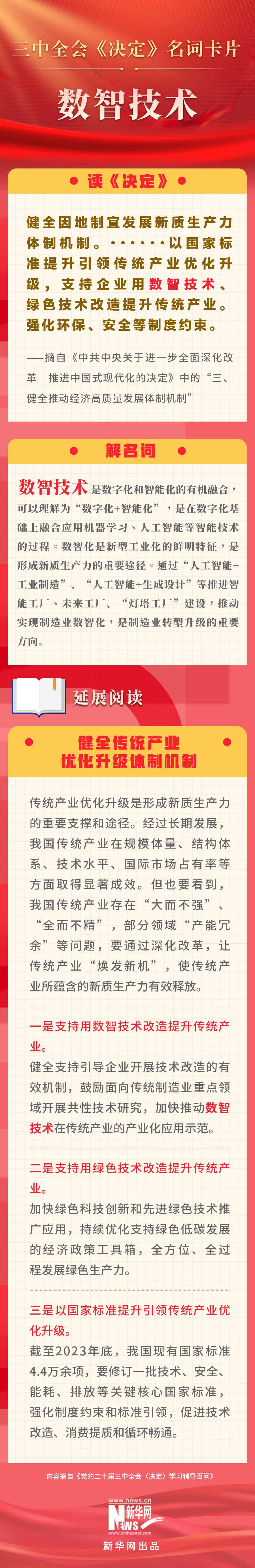 党的二十届三中全会审议通过了《中共中央关于进一步全面深化改革、推进中国式现代化的决定》。新华网依据《党的二十届三中全会〈决定〉学习辅导百问》,制作三中全会《决定》系列名词卡片,和大家一起来深入学习领会二十届三中全会精神。本期名词是“数智技术”。
