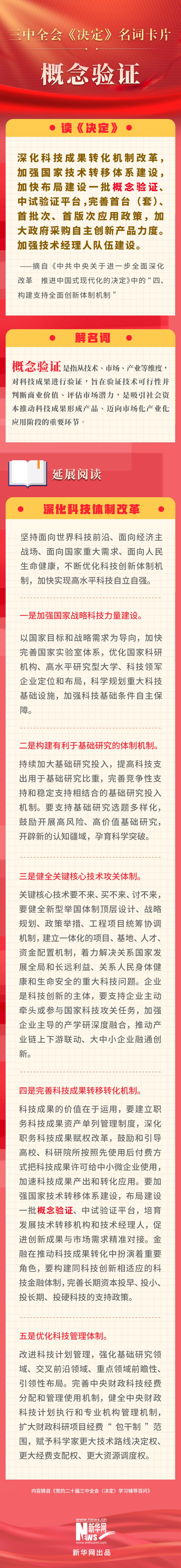 党的二十届三中全会审议通过了《中共中央关于进一步全面深化改革、推进中国式现代化的决定》。新华网依据《党的二十届三中全会〈决定〉学习辅导百问》,制作三中全会《决定》系列名词卡片,和大家一起来深入学习领会二十届三中全会精神。本期名词是“概念验证”。