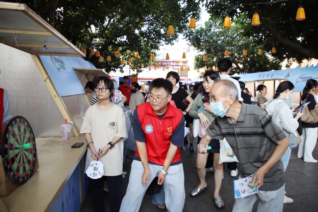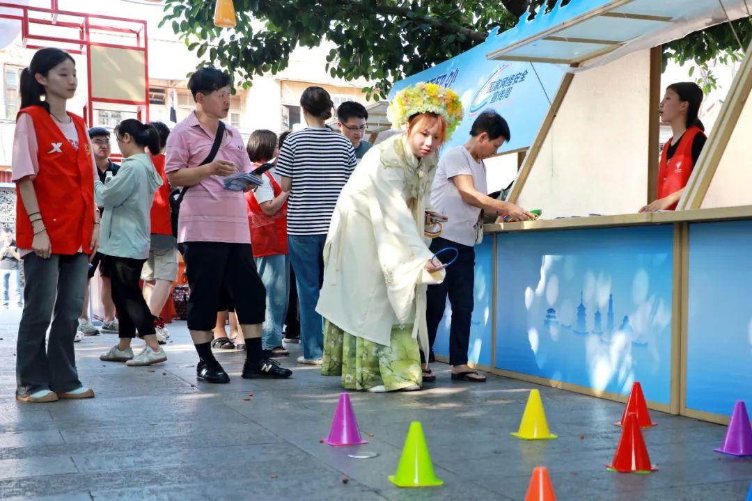 “往左一点!来,3!2!1!扔出去!唉,差一点……”在开元寺关卡中,不少群众手持集章卡排队通关套圈游戏,每人分到五个随机颜色的套圈,需要套中指定颜色的圆锥筒,若游戏失败,则需回答志愿者提出的网络安全相关问题方可集章。家住海滨街道水门社区的赖女士玩得不亦乐乎,“平常社区也经常宣传网络安全的相关知识,今天参加活动之后了解得更全面了。”当被问到如何防范电信网络诈骗?她自信回答:“最重要的是不要贪小便宜。”