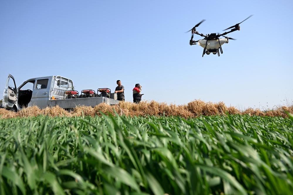 2024年3月22日,在安徽省合肥市庐江县同大镇,无人机手操作植保无人机为小麦施肥。新华社记者 黄博涵 摄