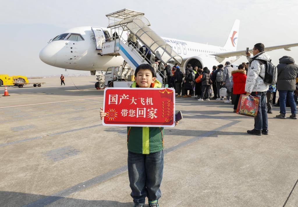 2024年1月26日,在上海虹桥机场,一位小旅客手举标语牌在国产大型客机C919前合影。新华社发