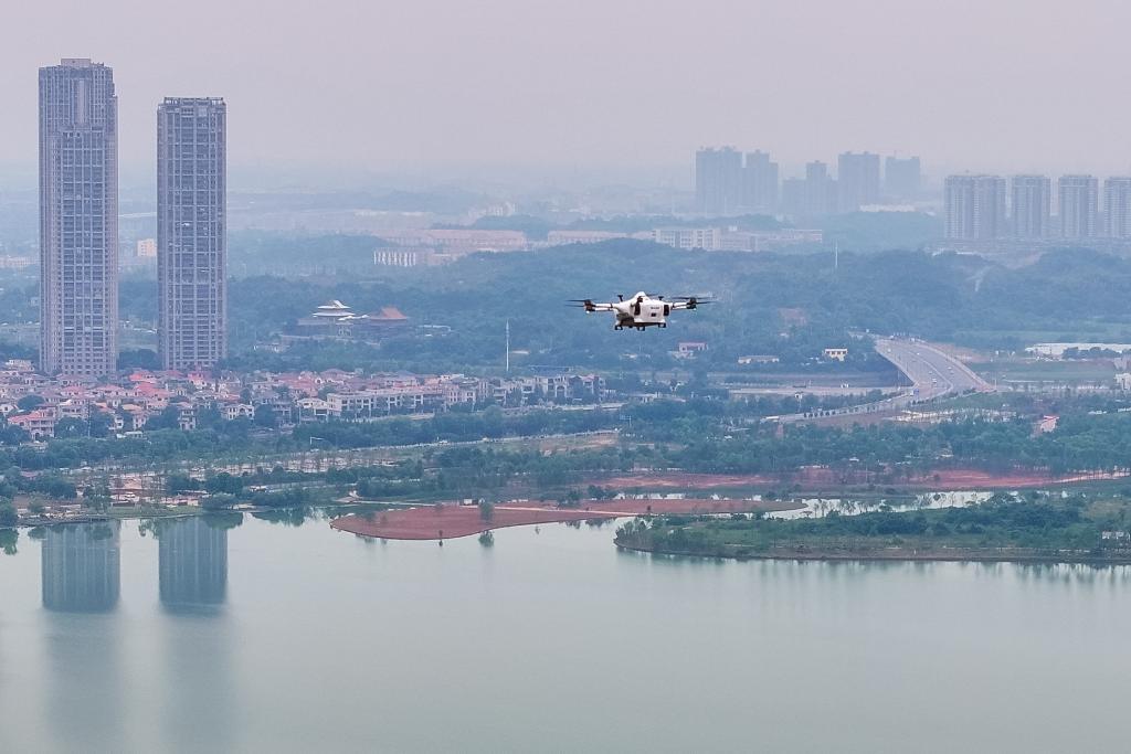 2024年5月7日,一台装有货品的物流无人机在长沙县上空飞行(无人机照片)。这是湖南首条常态化低空物流应用航线。新华社记者 陈思汗 摄