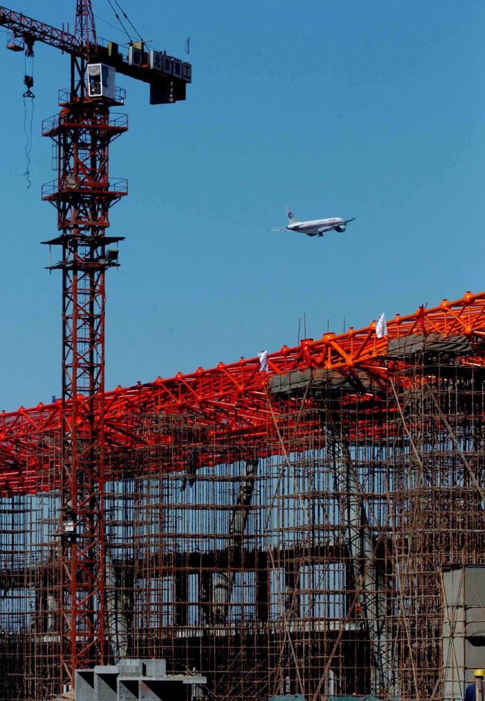 2005年10月29日,一架飞机从北京首都机场扩建工程T3B航站楼上飞过。当天,首都机场3号航站楼T3B国际港巨型钢网架胜利合龙,标志着T3B国际港钢结构如期顺利封顶。 新华社记者 李石磊 摄