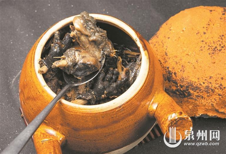 宋元遗风土窑鸡正是复刻了宋元遗风的一道经典美食,这道菜主材精选了清源山的放养乌鸡、生态老姜、山茶油等食材,用山土密封瓦罐炭火焖制而成,出锅后放入新鲜莲蓬,肉质细嫩、清香甘润、味道鲜美,有极高的滋补食养价值,是闽南传统的秋冬滋补药膳菜肴。