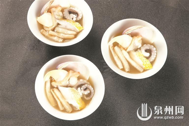 主要材料:本港小黄花鱼、长脚章鱼、蟳埔本港海蚌肉、沙虫、海石花。