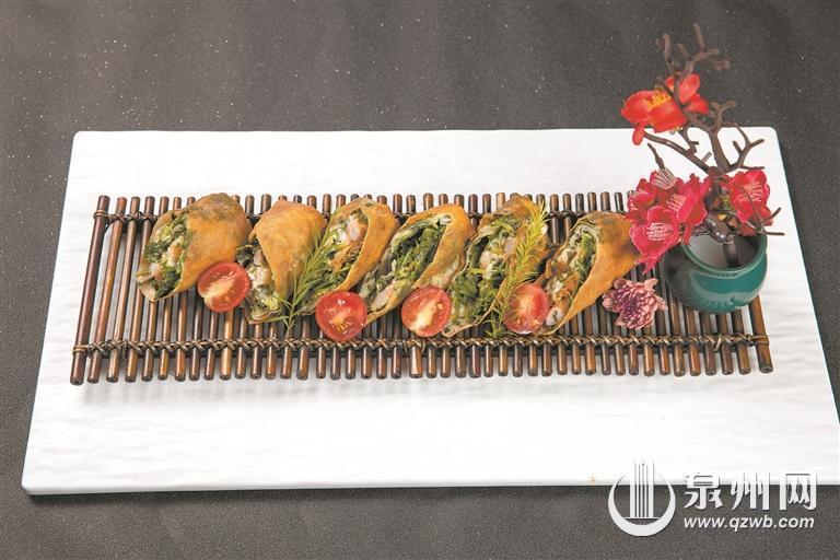 基于传统闽南春卷的制作基础,手工沙律海鲜卷在食材运用上加以创新,海鲜、沙拉酱等创新食材的运用,丰富了美食的口感,更加注重了营养配搭,这道吉祥如意沙律卷依然是一道闽南风味的特色小吃。