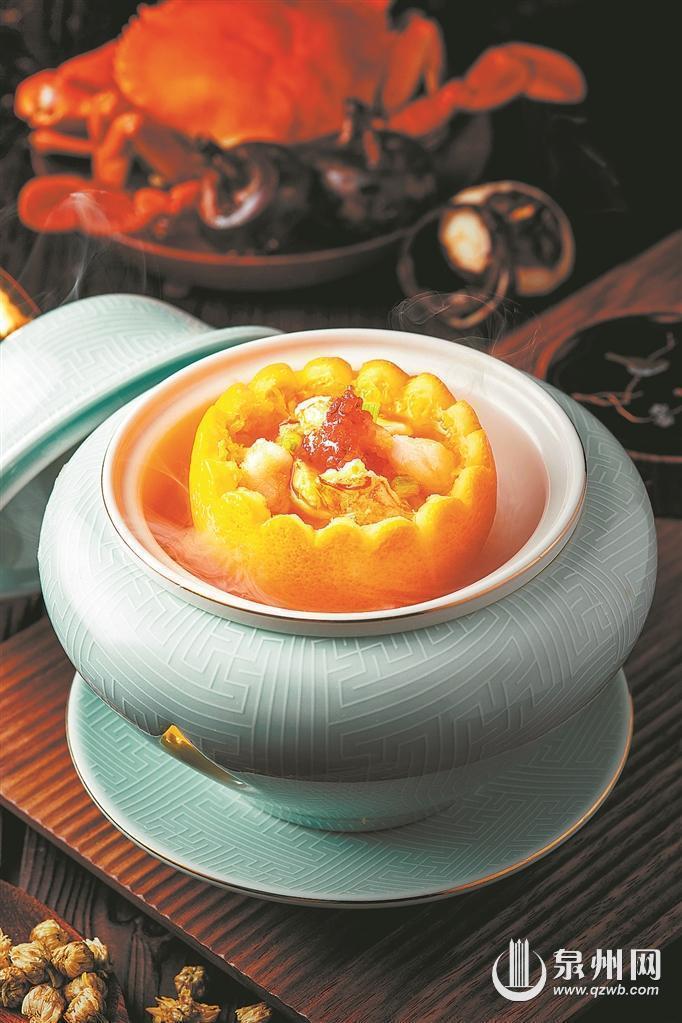 “橙大者截顶,剜去穰,留少液,以蟹膏肉实其内,仍以蒂枝顶覆之,入小甑,用酒、醋、水蒸熟,加苦酒入盐,供,既香而鲜,使人有新酒菊花、香橙螃蟹之兴。”蟹酿橙最早在《山家清供》中有记载,曾是南宋清河郡王张俊在府上为宋高宗所献御筵中的一道菜肴。“宋元海丝宴”中的山家蟹酿橙,以石狮特产的海蟹膏肉填充在橙子内,二者香气相融,尽显“黄中通理,美在其中”的精髓,也有菊花新酒、蟹黄橙香的风雅意境,南宋时期中国烹饪文化的审美呼之欲出。