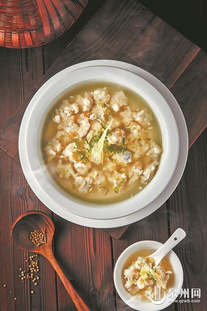 马鲛鱼羹则是石狮香油饭的最佳搭档。马鲛鱼是福建常见的经济鱼类之一,南宋晋江人梁克家《三山志》就有相关记载。烟火鱼羹取材马鲛鱼,搭配海上舶来品番薯粉,味道清香鲜嫩。制作过程中,为了使鱼肉更加紧实有弹性,要经过反复多次的锤打。鱼肉一次次的“历练”至口感劲韧的过程,仿佛石狮人在历史和时代的锤炼中,铸就了敢为天下先的改革精神、敢问路在何方的拼搏精神,以及敢教日月换新天的创新精神。