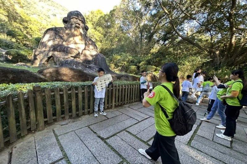 结束了老君的“拜访”,亲子家庭正式开启了山中漫步。绿意与暖阳随行,冬日的清源山依旧可爱。大家沿着“老君岩造像 → 智慧天阶 → 元元洞天 → 弘一法师舍利塔 → 振衣亭 → 第一山 → 千手岩 → 欧阳书院”的经典路线,感受着清源山自然和文化的交融之韵。