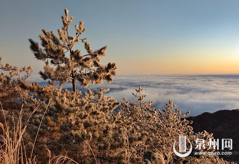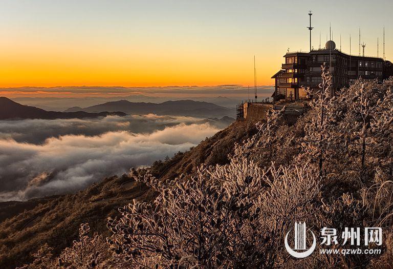 12月20日清晨,九仙山在日出时刻迎来美轮美奂的雾凇与云海。在日出之前,站在九仙山气象站附近远眺,山间白色云雾翻涌,即将醒来的戴云山犹如浮在云雾之上的静谧岛屿。6:49,初升的暖阳从戴云山的边缘探出了头,山间的云海,山坡的雾凇,山巅的气象站,瞬间被“点亮”。温暖的光芒,抚摸着脸庞,也为眼前的一切,涂上了金色的油彩。随着太阳越升越高,云海持续了大约一小时散去,晶莹剔透的雾凇,也开始消融。