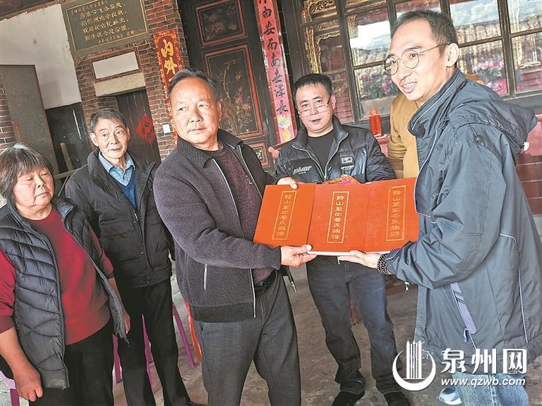 蔡贵荣(右一)收到故乡亲人赠送的族谱