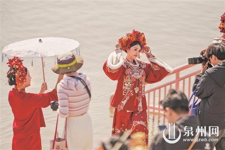 正月初二,在丰泽区蟳埔村,八方游客前往体验簪花围,头戴簪花的游客随处可见,为新春佳节增添喜庆氛围。 (融媒体记者陈起拓 摄)