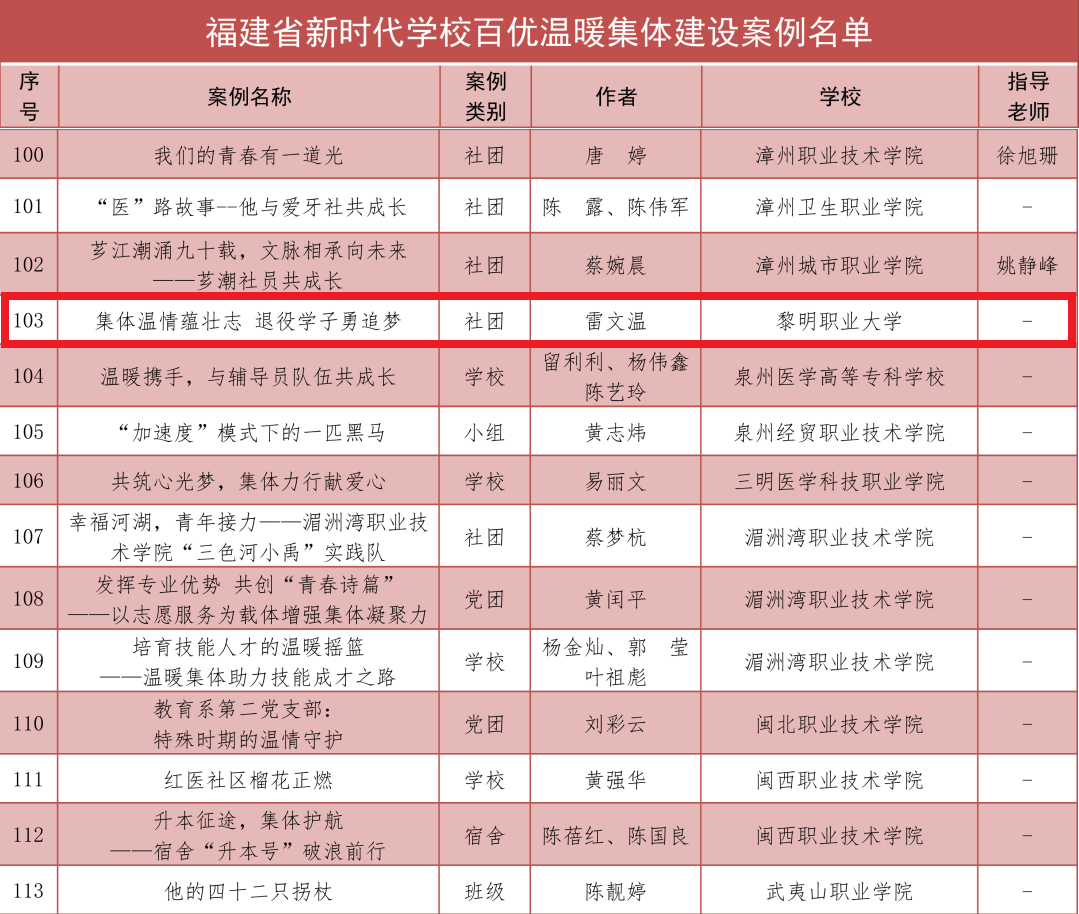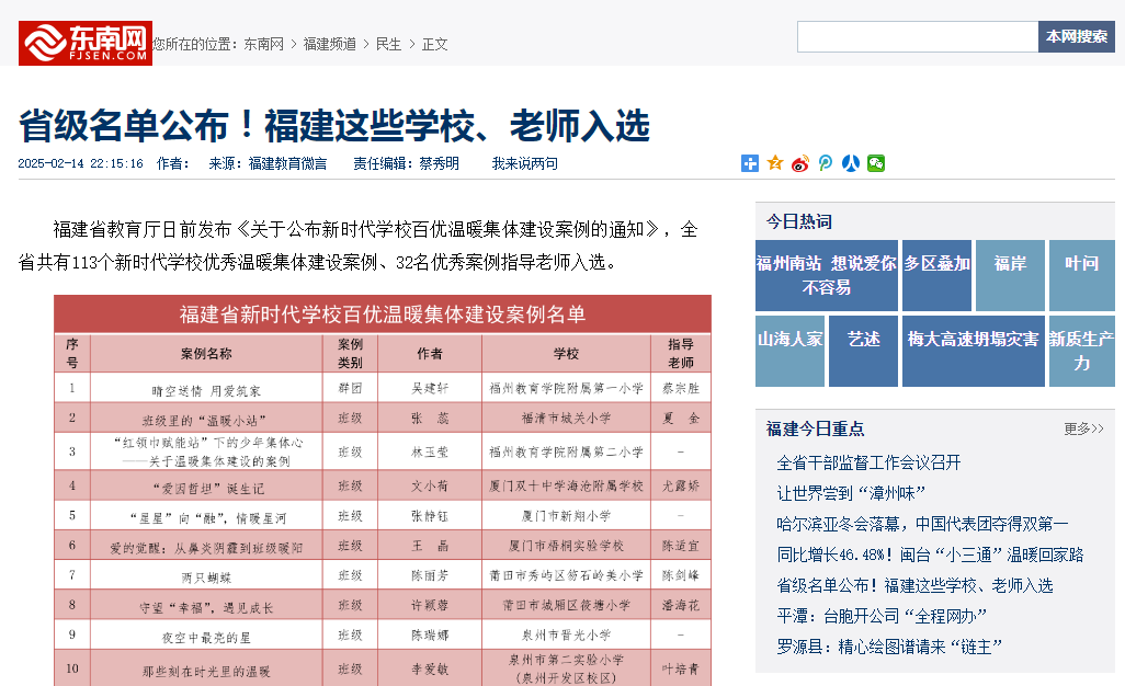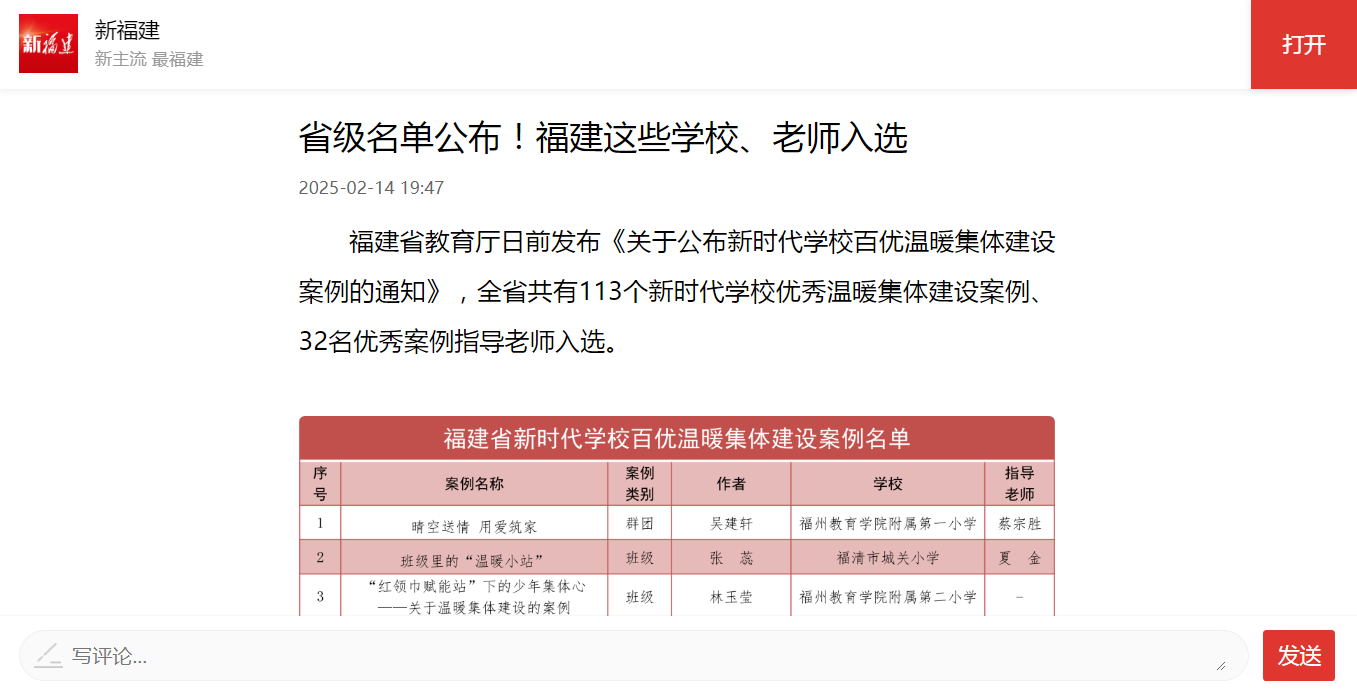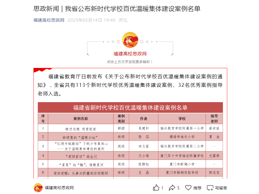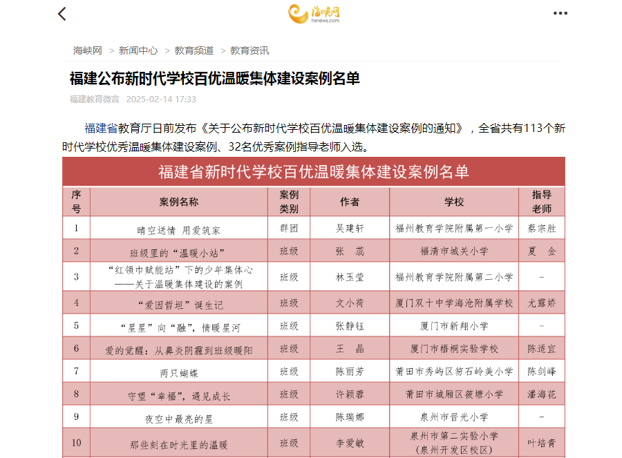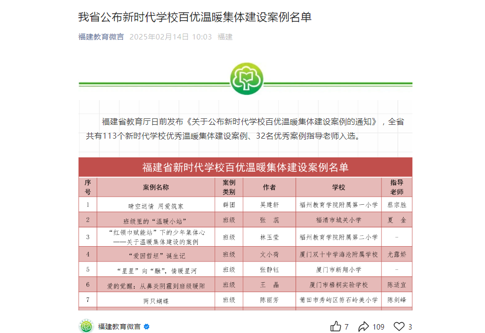 福建省教育厅日前发布《关于公布新时代学校百优温暖集体建设案例的通知》,全省共有113个新时代学校优秀温暖集体建设案例、32名优秀案例指导老师入选。