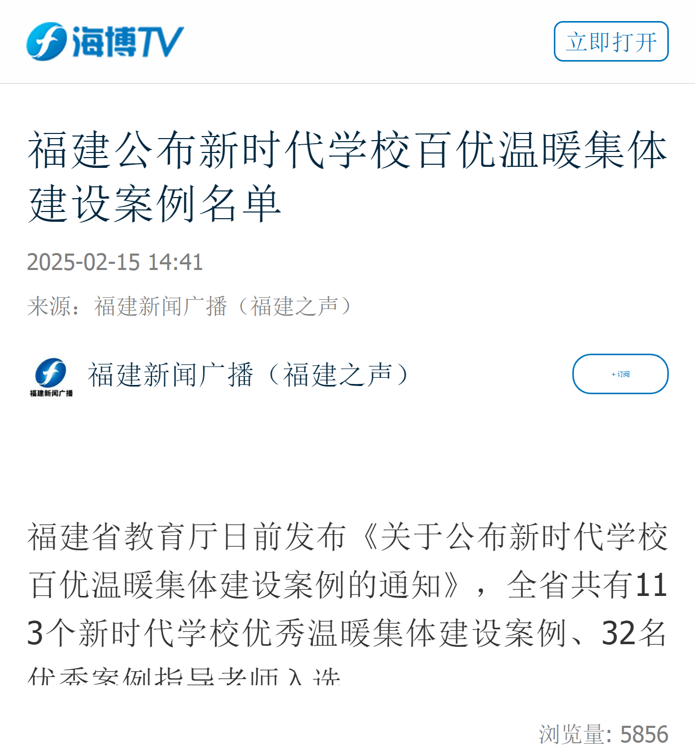来源:新福建2月14日、福建教育官微2月14日、东南网2月14日、福建高校思政网官微2月14日、海峡网2月14日、海博TV2月15日