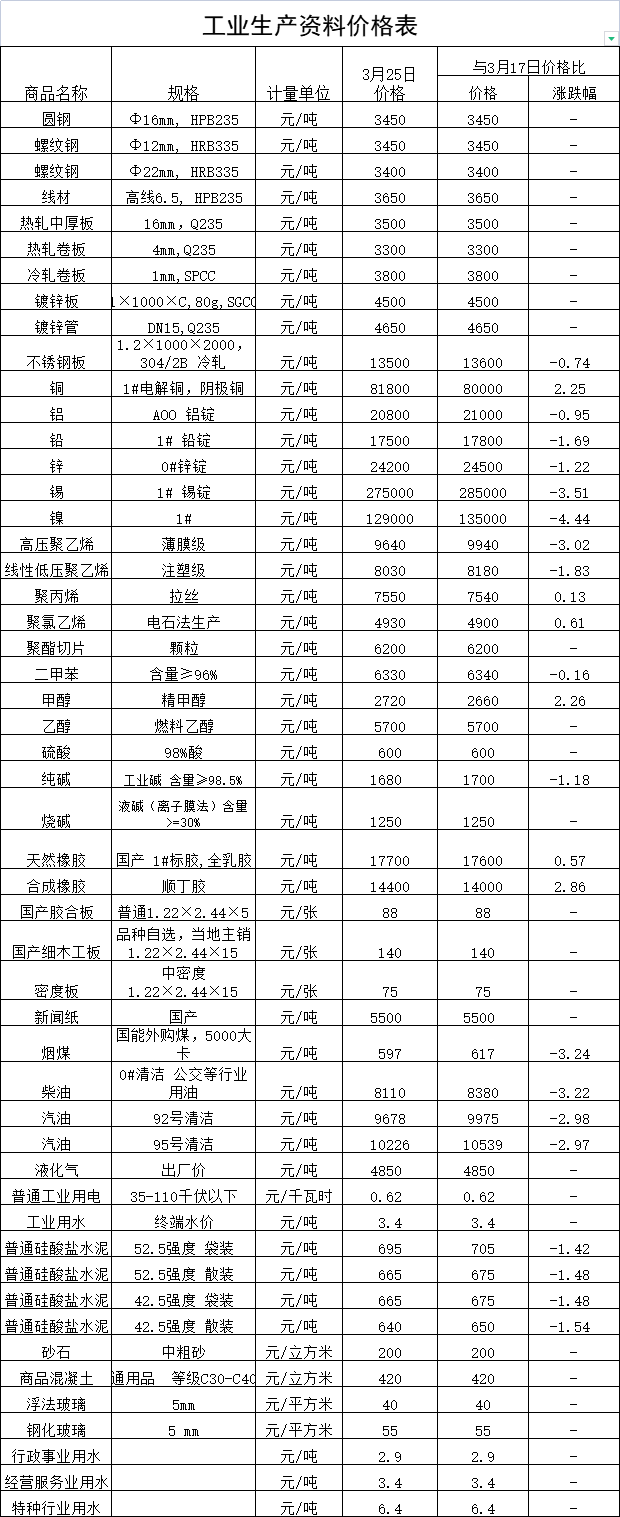 据监测,本期工业生产资料价格稳中趋跌,对比3月17日(下同),监测的51种工业生产资料价格18跌27平6涨。其中,钢材价格稳中有跌。本期,我们监测的10种钢材价格9平1跌,其中,不锈钢板1.35万元/吨,微幅下跌0.74%。有色金属价格跌多涨少。我们监测的6种有色金属价格5跌1涨,其中,铜8.18万元/吨,上涨2.25%;铝2.08/万元/吨,铅1.75万元/吨,锌2.42万元/吨,锡27.5万元/吨,镍12.9万元/吨,分别下跌0.95%、1.69%、1.22%、3.51%、4.44%、3.02%。成品油价格小幅下跌。3月19日24时,国家发展改革委按机制调整成品油价格,其中,0#柴油8110元/吨,92#汽油9678元/吨,95#汽油10226元/吨,平均跌幅3.06%。水泥价格小幅下跌。我们监测的52.5强度袋装水泥695元/吨,散装水泥665元/吨,42.5强度袋装水泥665元/吨,散装水泥640元/吨,平均跌幅1.48%。监测的其他品类价格相对稳定。