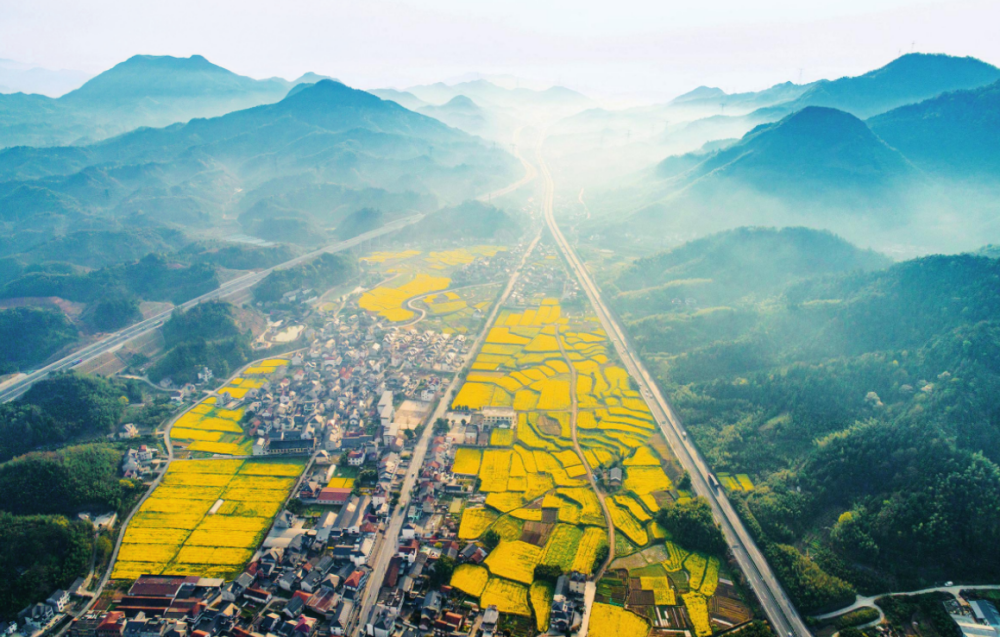 在浙江省杭州市临安区天目山镇横塘村,油菜花田与村庄、公路、群山构成一幅美丽画卷(2025年4月2日摄)胡剑欢摄/本刊