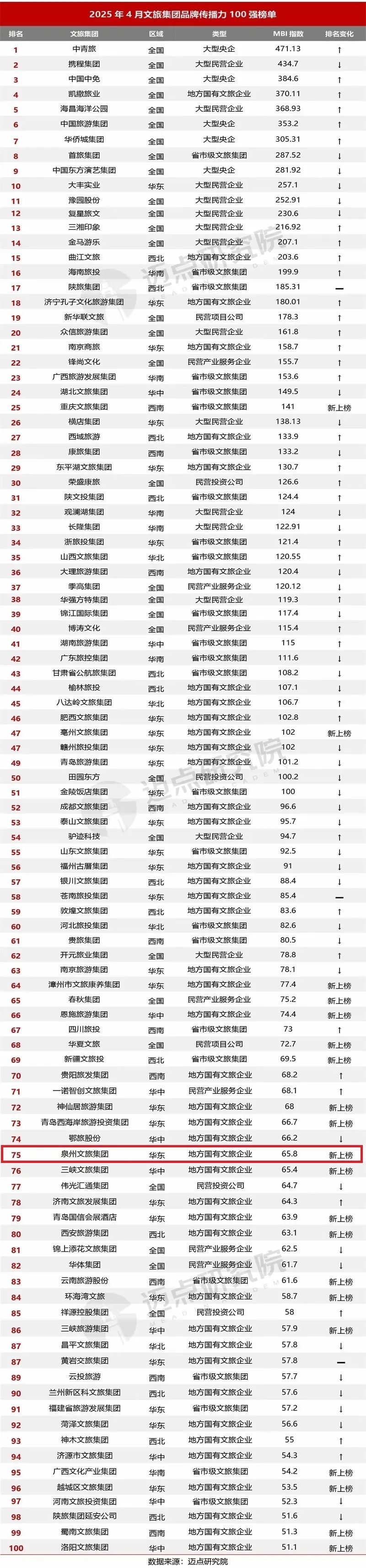 2025年4月,根据迈点研究院独家发布的“2025年4月中国文旅集团品牌传播力100强榜单”,泉州文旅集团荣登“2025年4月年中国文旅集团品牌传播力100强榜单”第75名。