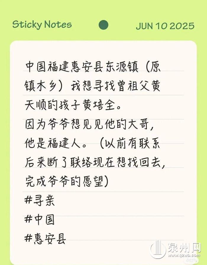 时间回溯至2025年6月10日,泉州紫云宗亲联络办公室的“笙羽先生”黄景达宗亲收到了一条来自新加坡的寻根信息。发信人黄依敏表示,其祖父(福建人)希望找到曾祖父黄天顺的孩子黄培全,以了却多年心愿。双方曾有联系,后因种种原因断了联络。信息中提及的祖籍地“中国福建惠安县东源镇(原镇木乡)”,引发了宗亲联络办公室的细致分析。