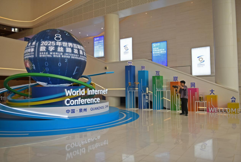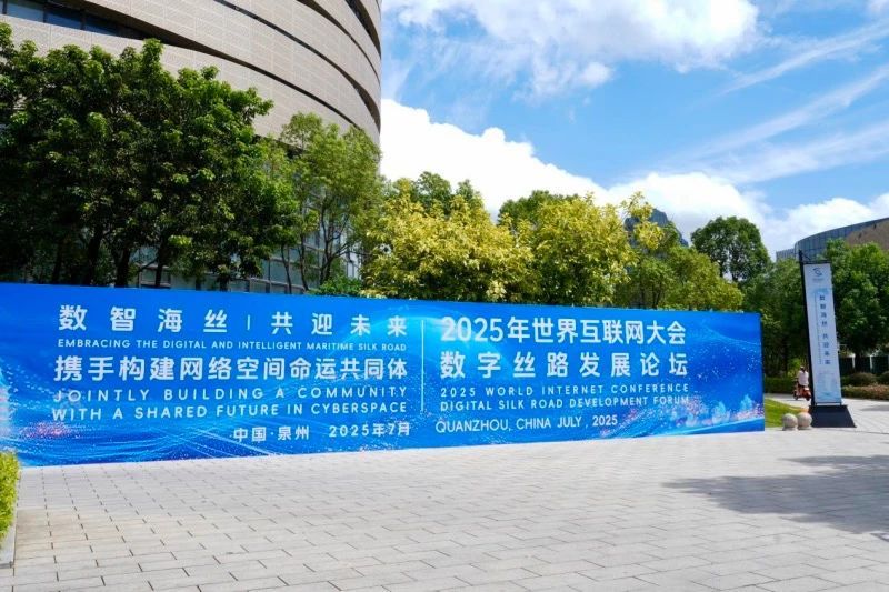 7月23日,泉州大剧院外2025年世界互联网大会数字丝路发展论坛标识。