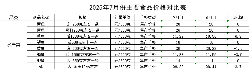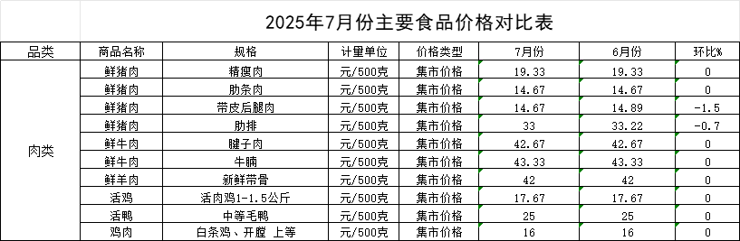 肉类价格整体平稳,个别品种略有回落。监测的10种肉类均价环比呈8平2跌。其中,带皮后腿肉均价为14.67元/斤,环比下跌1.5%;猪肋排均价为33元/斤,环比下跌0.7%,主要受生猪出栏量增加及夏季肉类消费淡季影响,市场需求偏弱。精瘦肉(19.33元/斤)、猪肋条肉(14.67元/斤)、牛腱子肉(42.67元/斤)、牛腩(43.33元/斤)、鲜羊肉(42元/斤)、白条鸡(16元/斤)、活鸡(17.67元/斤)和活鸭(25元/斤)等品种价格保持稳定,未出现明显波动,表明畜禽养殖产能总体均衡,市场调节机制运行良好。