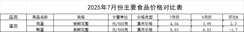 蛋类价格走势分化,鸡蛋上涨、鸭蛋回落。7月份,鸡蛋均价为4.04元/斤,环比上涨2.3%,主要受高温导致蛋鸡产蛋率下降、养殖成本上升以及开学季前备货需求提前释放等因素共同推动。相比之下,鸭蛋均价为5.93元/斤,环比下跌1.7%,或与水禽养殖恢复较快、市场供应相对宽松有关。