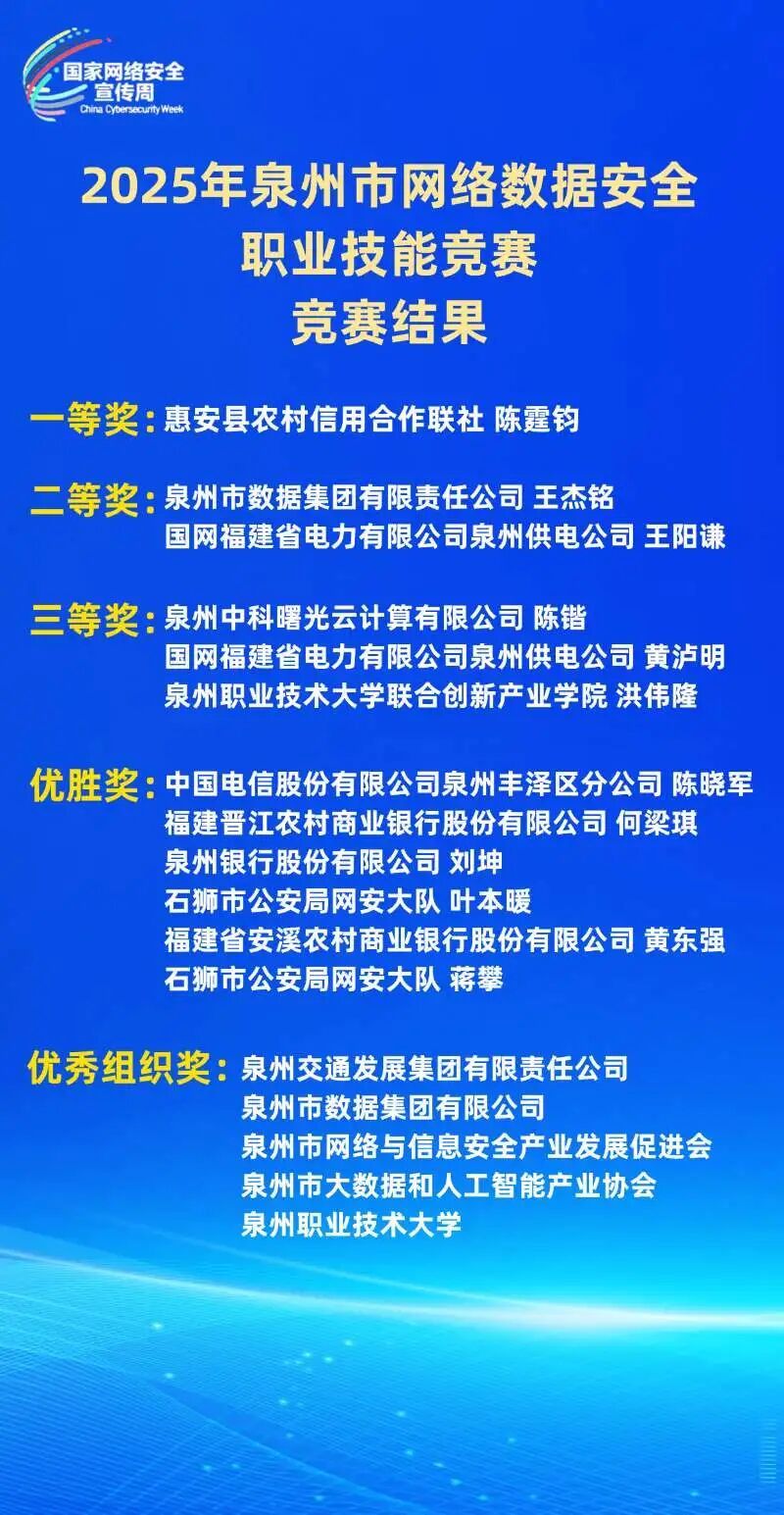 本次竞赛一、二、三等奖和优秀组织奖将在2025年国家网络安全宣传周泉州市活动开幕式上进行颁发。成绩合格的选手,竞赛组委会办公室将统一向市人社部门申请颁发“信息安全管理”专项能力证书。