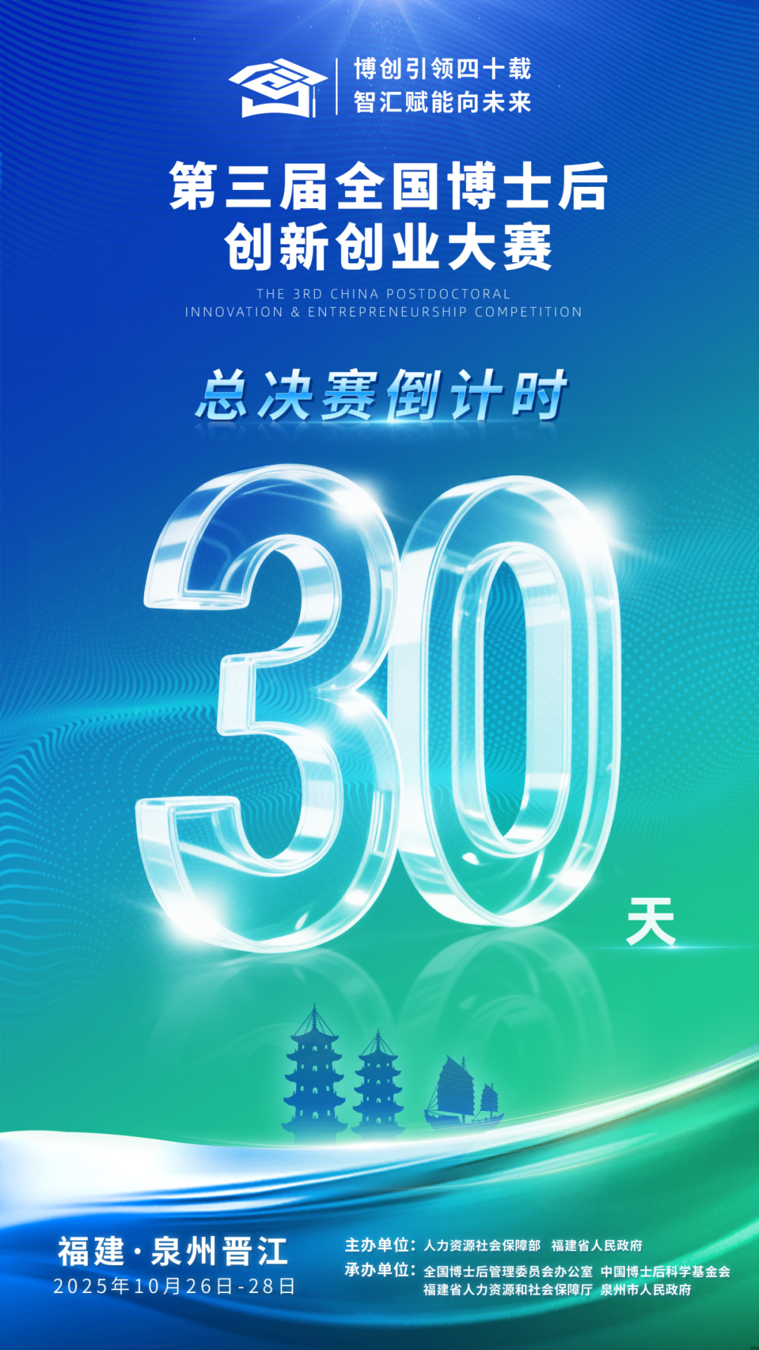 10月26日-28日,人力资源社会保障部、福建省人民政府将在福建省泉州市举办第三届全国博士后创新创业大赛总决赛,随着30天倒计时的开启,大赛各项筹备工作已进入最后冲刺阶段。