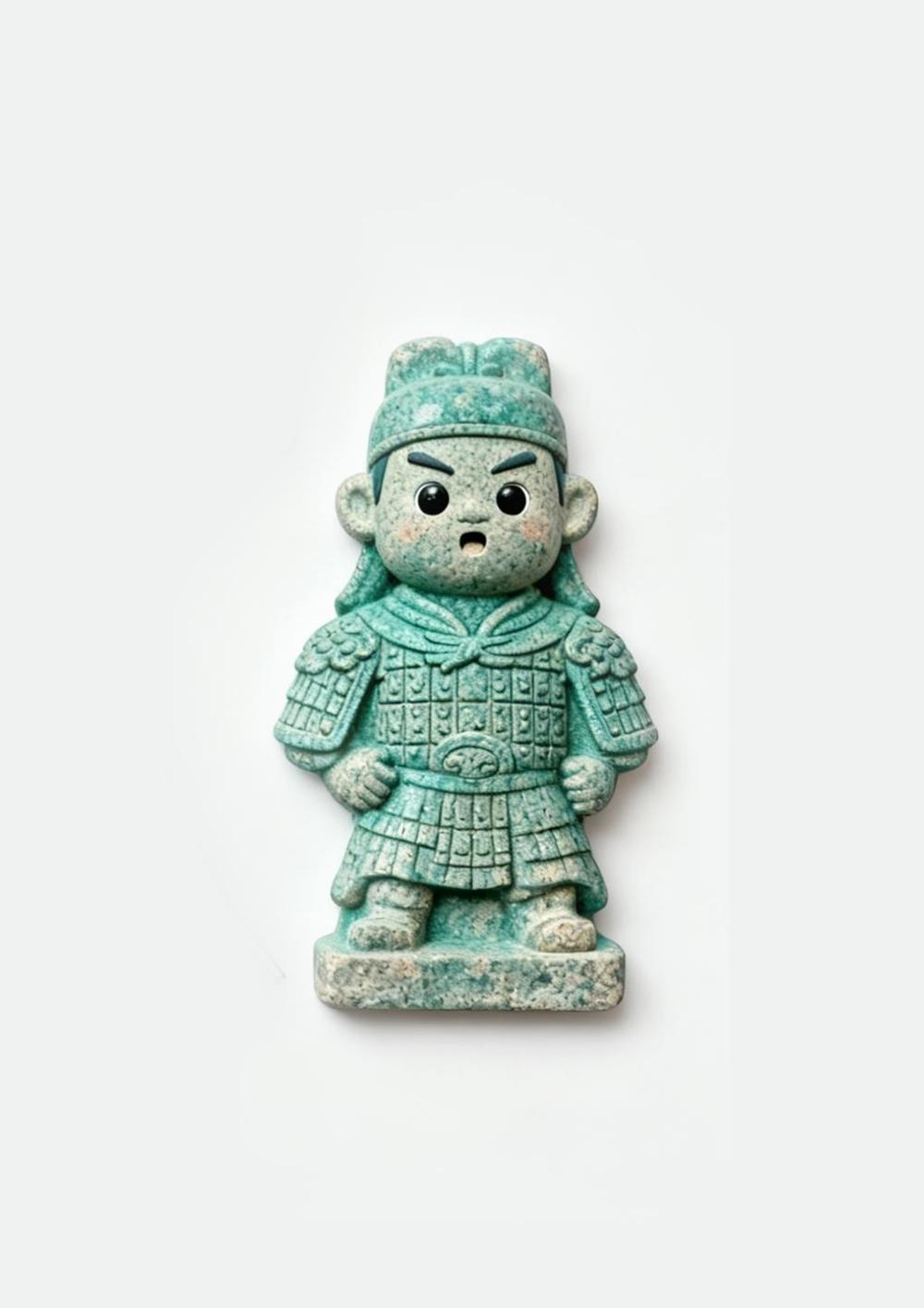 作品以戚家军古代铠甲人物为原型进行文创设计,整体采用青绿色调,带有古朴的质感,承载着历史的厚重。作者对人物面部进行了卡通化处理,“大眼睛、红扑扑的脸颊和张开的嘴巴”增添了可爱活泼的气息,弱化了铠甲原本的严肃感。作品既保留了传统文化中铠甲所象征的英勇、守护的内涵,又通过萌趣的设计,让文创产品更贴近现代大众,尤其是年轻群体。