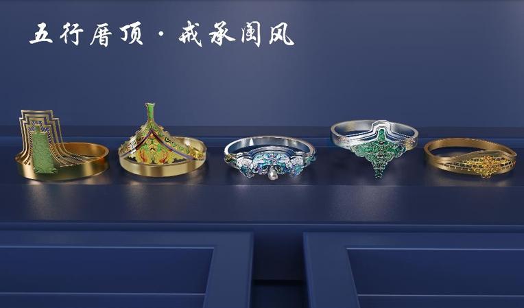作品的“厝角头”和阴阳五行密切相关,其形状也与金木水火土一一对应。闽南乡土建筑既是一种物质产品,同时也是一种精神符号,作品提取闽南古厝元素,结合常见配饰戒指对古建筑艺术重新演绎,让人们感受独具特色的闽南传统文化。