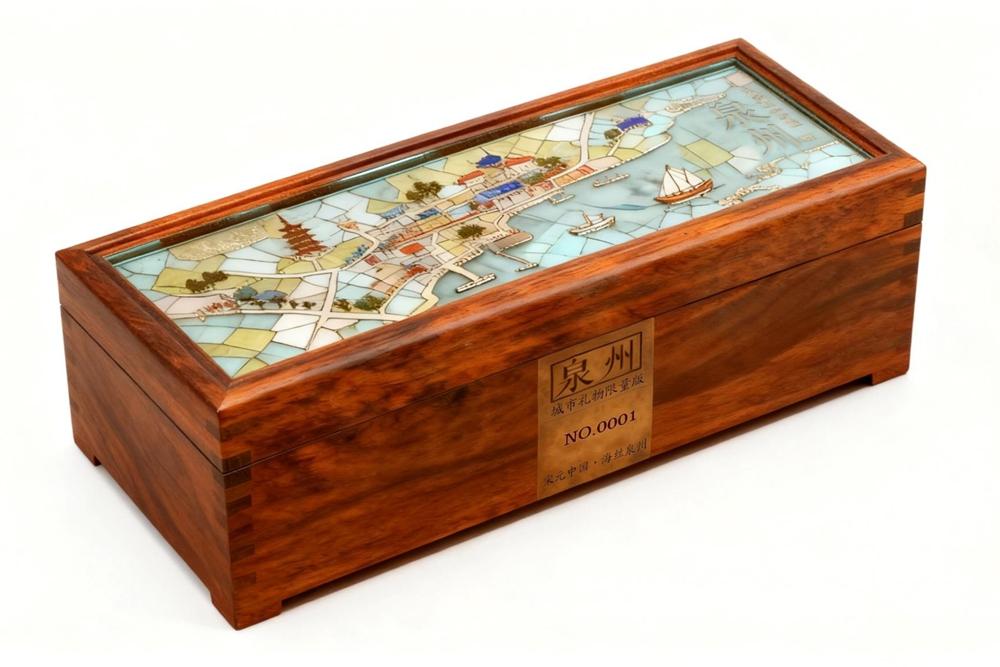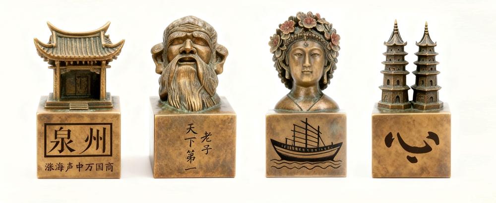 在外包装上,作品以非遗螺钿工艺精心制作古泉州港地图轮廓,呈现宋元时期泉州盛景,尽显格调与典雅;在产品细节上,四枚黄铜锻造的印章分别聚焦泉州标志性元素,将泉州的历史文化、民间信俗等元素巧妙融合。整个礼盒,既是实用的印章器具,又是蕴含城市精神的珍贵礼物。