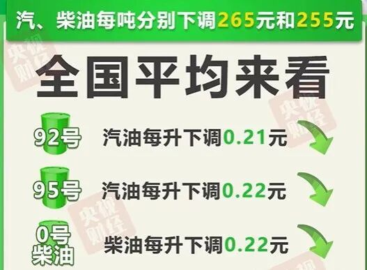 国家发展和改革委员会发布最新油价调整消息,根据10月27日前10个工作日平均价格与上次调价前10个工作日平均价格对比情况,按照现行成品油价格机制,自10月27日24时起,国内汽、柴油价格(标准品,下同)每吨分别降低265元和255元。