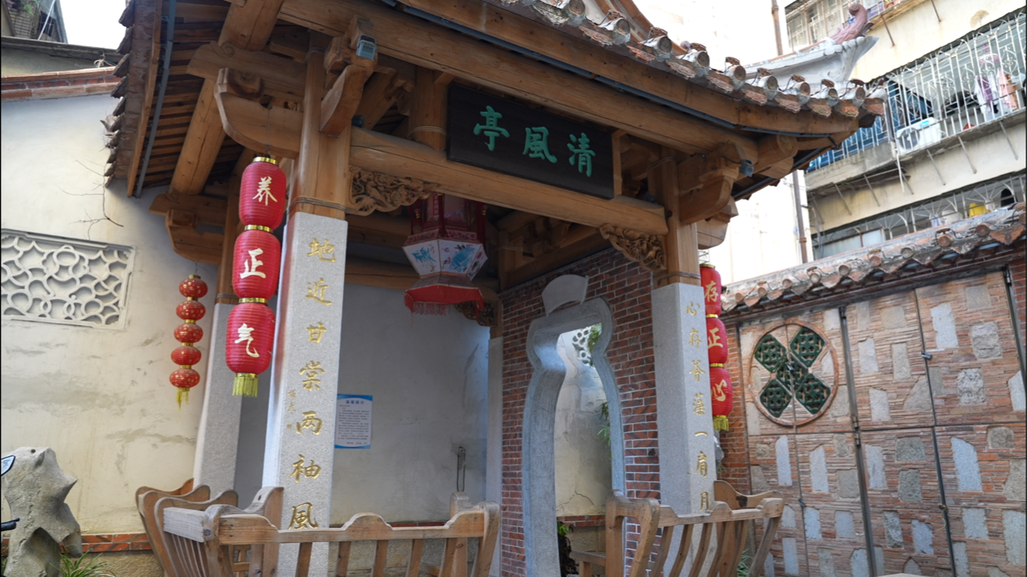 主题墙的尽头,是清风亭主题公园,由一座古朴的“清风亭”、太湖石景观小品和闽南传统出砖入石墙面营造而成,古风古韵十足,高颜值、有内涵,如今,廉政文化主题墙与清风亭,已成为三朝巷的网红打卡点。