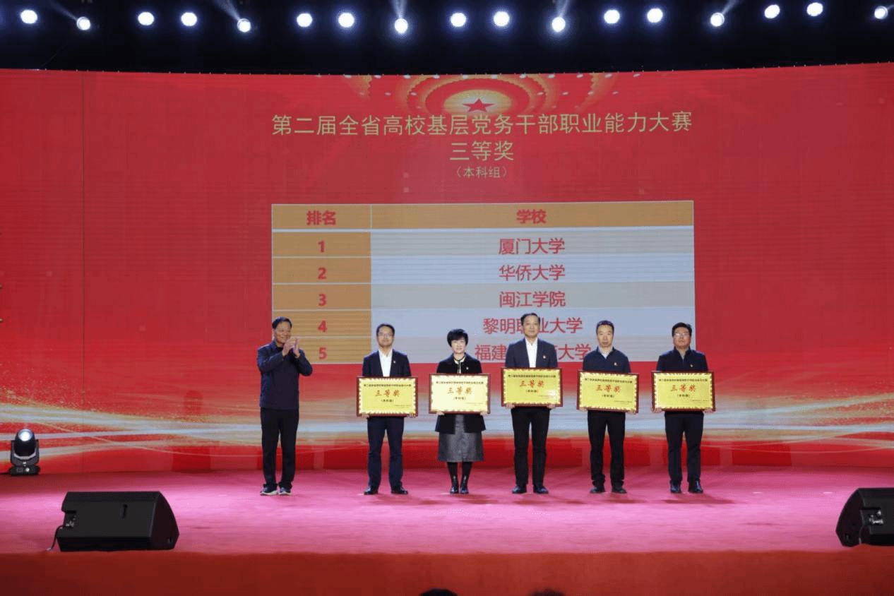 近日,第二届福建省高校基层党务干部职业能力大赛圆满落幕。黎大由黄婷婷、尤杰舜、蔡安怡老师组建的参赛团队在全省42所本科高校、126名选手的激烈角逐中脱颖而出,比赛总分位居全省本科组第九名,荣获团体三等奖、主题党日策划单项奖第五名。这是黎大首次亮相本赛事本科组,充分彰显了我校基层党务工作者过硬的职业素养与昂扬向上的精神风貌。