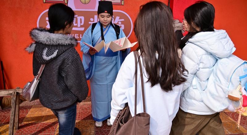 营员们与扮演市舶司吏员的剧本角色互动,模拟演绎征收舶货关税、发放贸易凭证等剧情。(图片来源:东南旅行社)