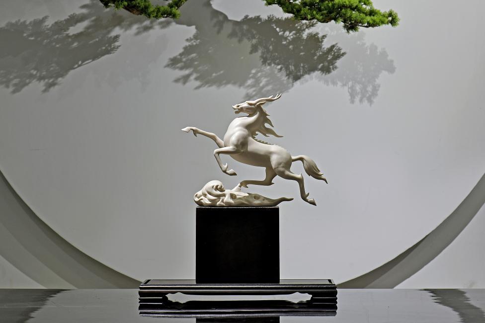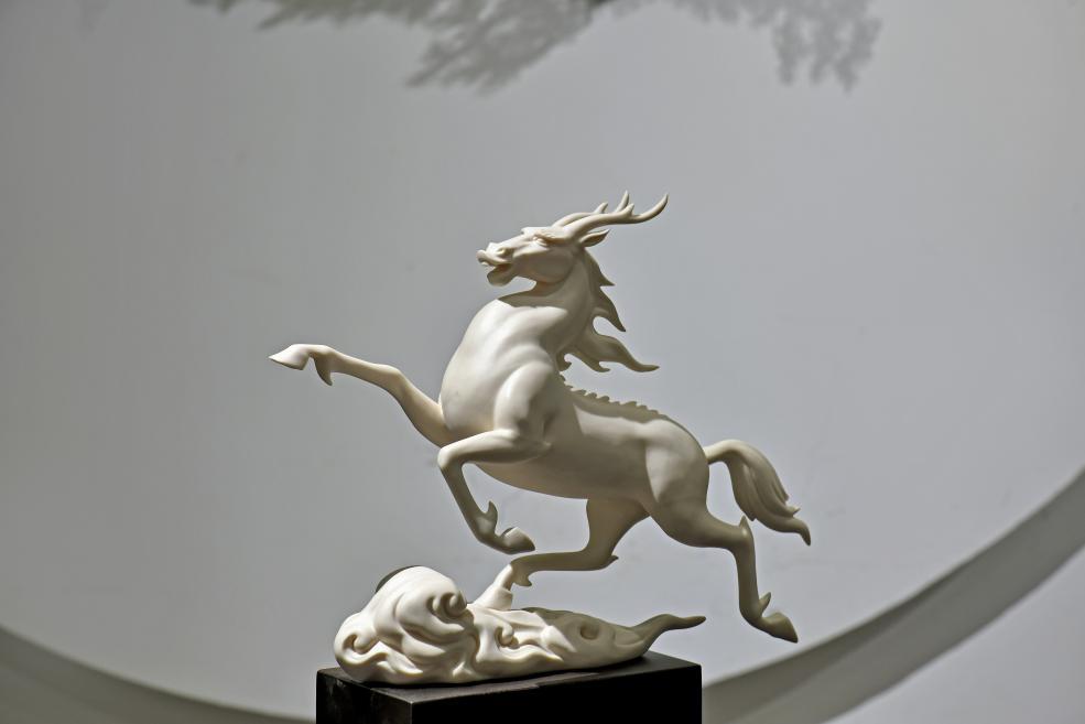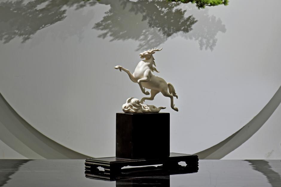 作品以德化白瓷温润莹洁之质,塑"龙马祥瑞"吉祥意象,融传统文脉与当代审美于一体。以精湛的瓷塑技艺,将龙的灵动与马的俊逸刻画得形神兼备,线条流畅婉转,肌理细腻传神,尽显德化白瓷雕塑"形随韵出"的艺术精髓。