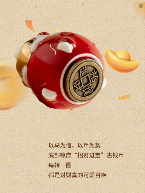 以马为信,以币为契。底部镇嵌“招财进宝”古钱币,每转一圈都是对财富的可爱召唤。
