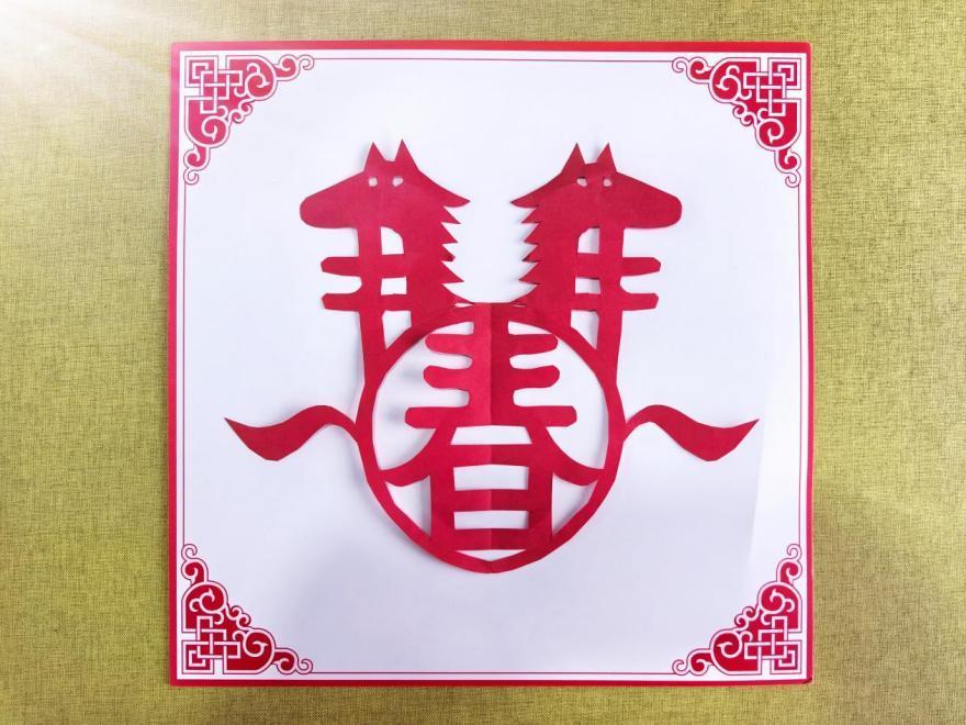 以双马拱“春”为核心造型的新春剪纸窗花,采用对称式构图,融合生肖马的灵动线条与春字的喜庆寓意,传递马年新春的吉祥祝福与盎然生机。